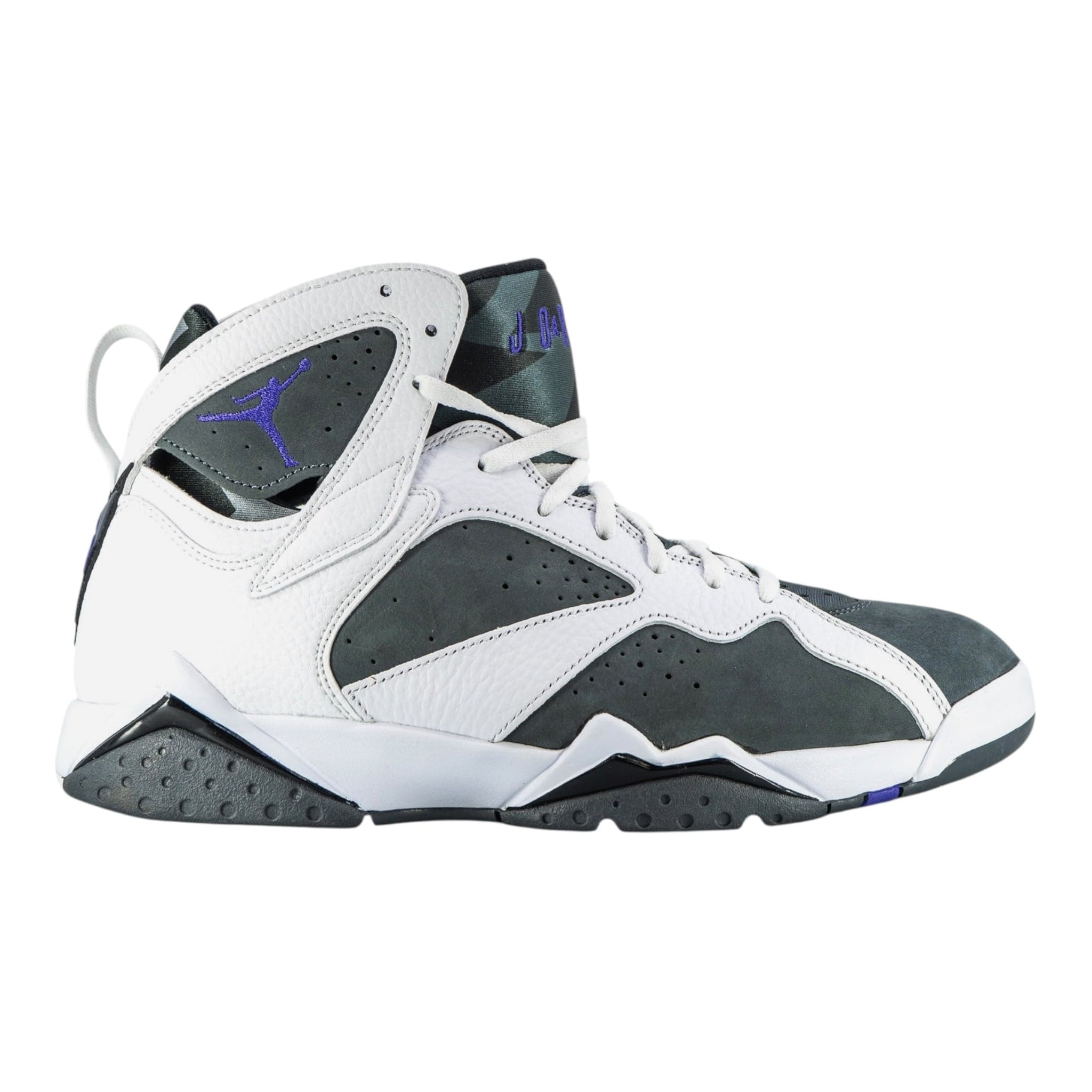The upper of the Air Jordan 7 Flint is made with white leather and Flint Grey Durabuck while hits of purple appear on the side Jumpman logo, tongue, and rubber heel patch. A polyester tongue with a grey, white, and black geometric pattern completes the Retro release.