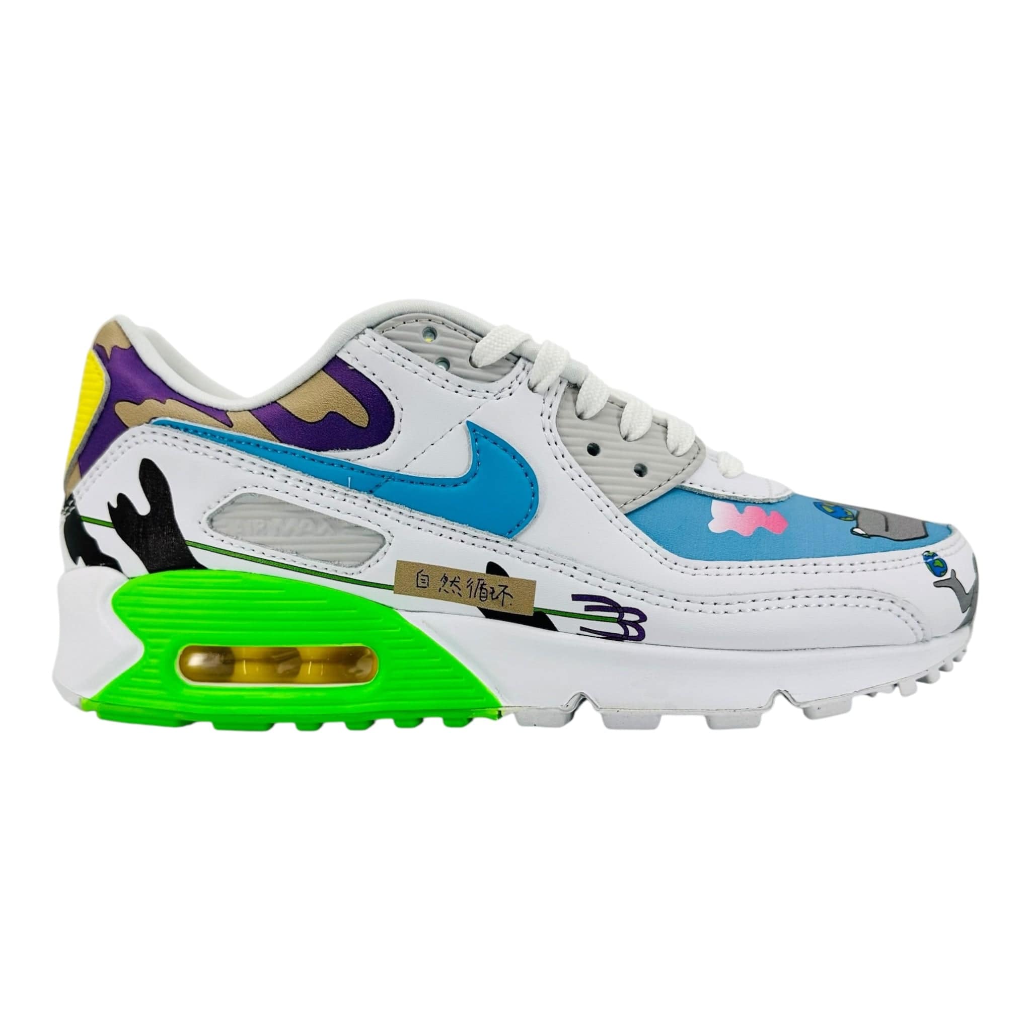 The Nike Air Max 90 Flyleather Ruohan Wang features a Multicolor Flyleather upper with graphics from artist Ruohan Wang. From there, an exposed Air Max sole completes the design.