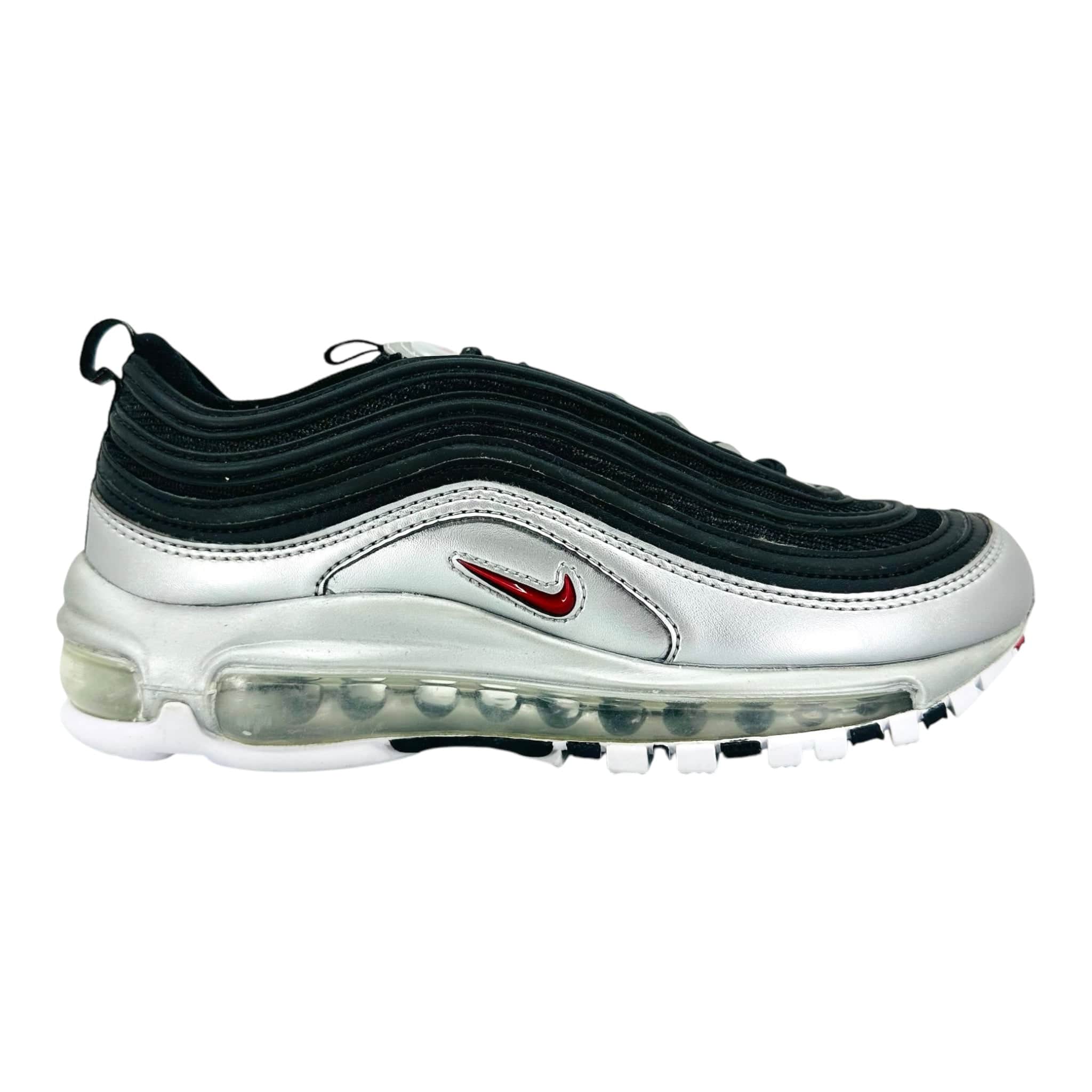 Water droplets and Japanese trains inspired the Nike Air Max 97 Silver Black. This retro, running-inspired design comes in a black/Varsity-Red/Metallic-Silver/white colorway. The shoe gets its signature look from reflective piping and wavy design lines.