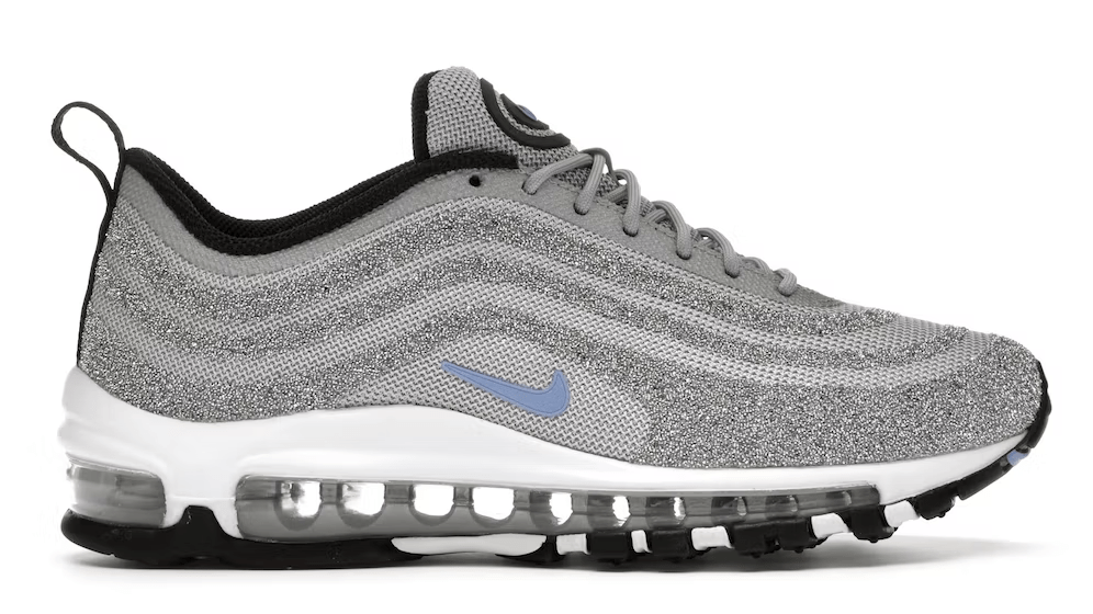 Nike and Swarovski came together yet again on the Air Max 97 in 2021. This collaboration came just in time for Air Max Day of that year, adding another sparkling selection to celebrate the annual holiday. This marks the fourth time the two brands have worked on the Air Max 97, revamping the original Polar Blue colorway from 1997. The women's Nike Air Max 97 Swarovski Polar Blue is a disco ball for your feet, as the upper is covered in many Swarovski crystals. Underneath the crystals is a grey mesh that adds flexibility, breathability, and additional comfort to the mostly Air bubble midsole. From there, hits of Polar Blue appear solely on the Swooshes located on the tongue, side panels, and outsole. Lastly, the 97’s classic 360-degree Air bubble cushioning system brings the silver bullet train-inspired kicks together. The women's Nike Air Max 97 Swarovski Polar Blue released in March of 2021 for $400.