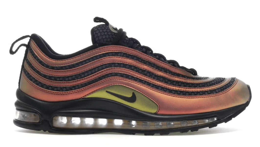 This Nike Air Max 97 Ultra 17 was designed by British-Nigerian artist, Skepta. Inspired by the original Air Tuned Max from 1999, they come in a multi-color, black and vivid sulfur colorway. Connecting Morocco to London, they feature an iridescent, polyutherane-coated, copper/rose gold leather upper with black sandwich mesh and an HF weld of the Swoosh logo (instead of an embroidered Swoosh) on the sides. Other details include: braided embroidery along the tongue and heel that reference the embellished sportswear Skepta saw locals wearing during trips to Morocco, custom printed insoles featuring Moroccan patterns that incorporate the Swoosh logo along with an "SK" logo that pays homage to the Air Max TN logo and is in the shape of a UK electrical outlet and a black sole with a yellow Max Air unit. The release date for the Skepta x Nike Air Max 97 Ultra 17 was September 2nd, 2017. They were available at select Nike Sportswear retailers worldwide in men's sizing, where they retailed for $180. Fans of Skepta and the Air Max 97 need to have these in their rotation. If you have a pair to sell, hit up the marketplace and see what they are currently going for. Those looking to buy can do so online, now.
