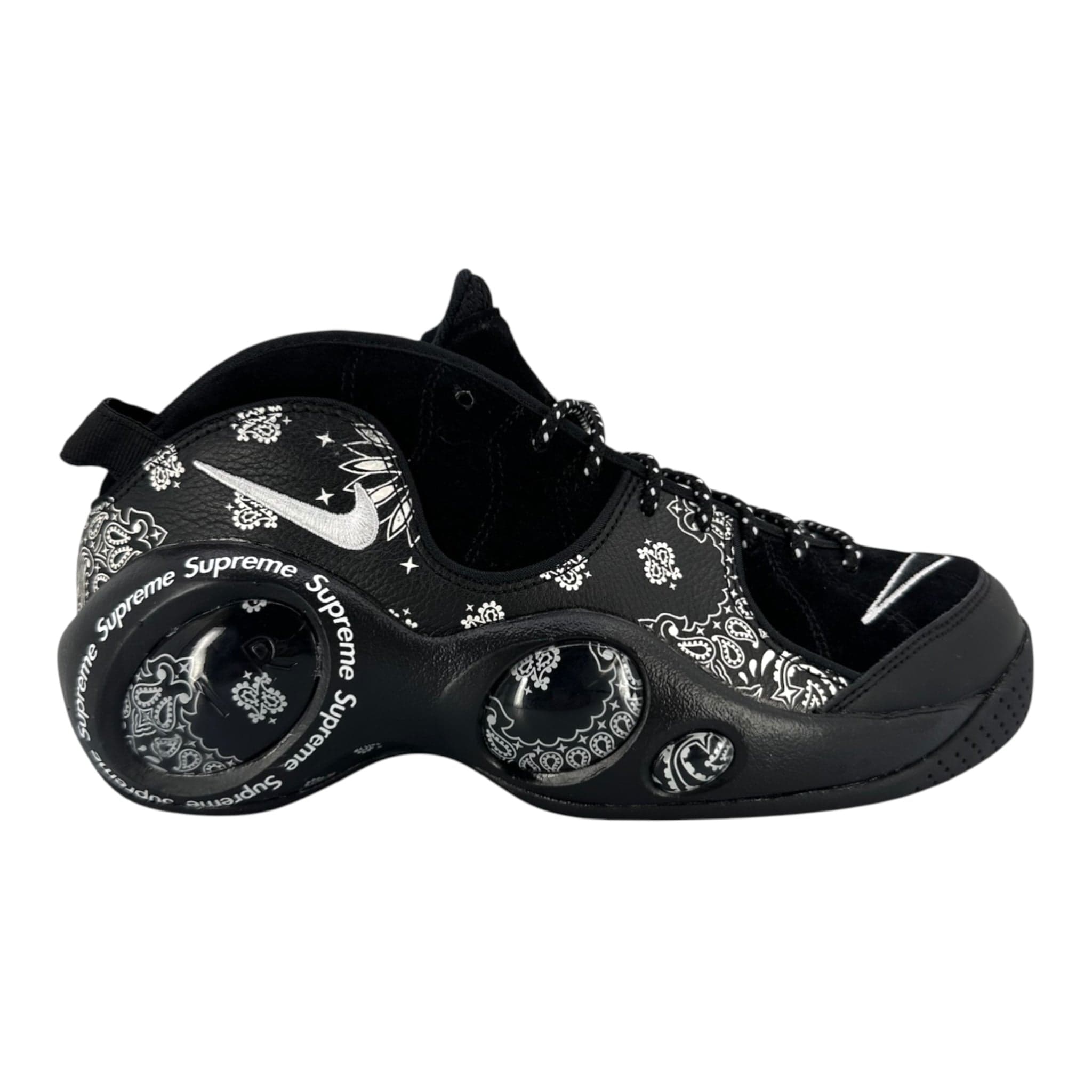 The Nike Air Zoom Flight 95 SP Supreme Black features a black Durabuck upper with black paisley patterned leather overlays and Swoosh embroideries. Two-tone rope laces provide a hiking shoe feel. At the base, an Air Zoom sole with matching paisley inserts and Supreme logo branding complete the design.
