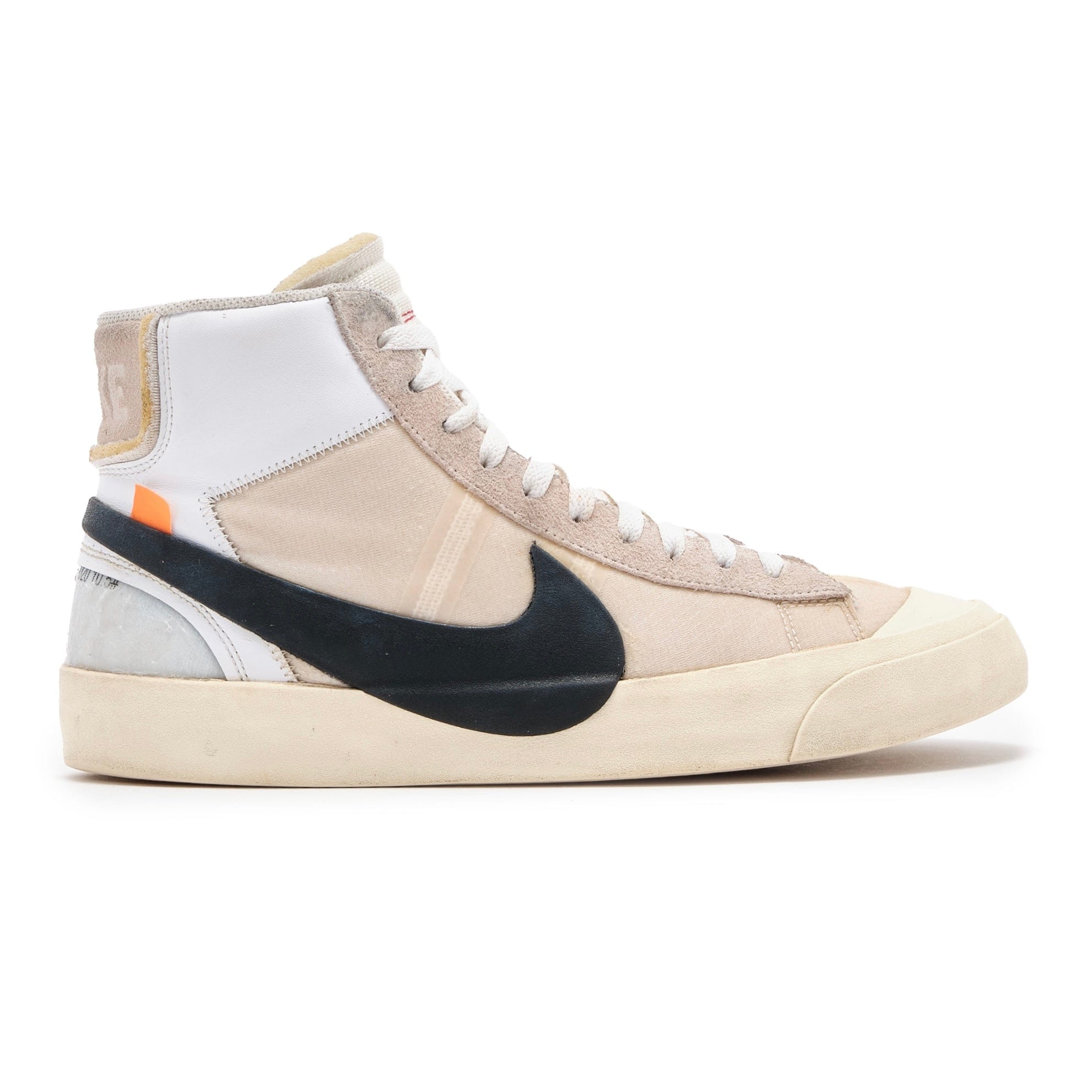 An integral part of Virgil Abloh's debut Nike collaboration titled "The Ten", the Nike Blazer Mid Off-White reflects Abloh's appreciation for reconstruction in design. This Blazer features a leather and mesh off-white upper with oversized Swoosh overlays that overlap the midsole and a grey Durabuck heel tab. On the medial side of the upper, the signature Off-White return address graphic is stamped. From there, a yellowed sole provides a vintage aesthetic.