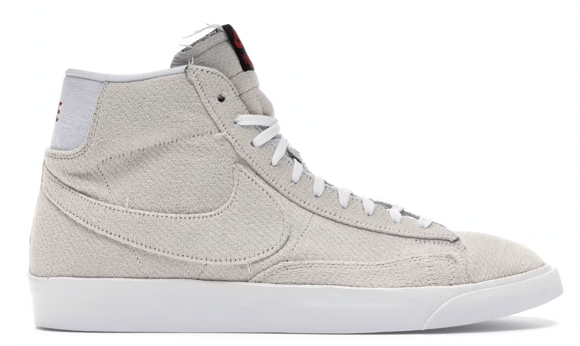 This Blazer Mid features a sail woven-like textured upper that reveals hidden Upside Down layer underneath when removed. Printed insoles with graphics of plans and sketches, red branding on the tongue labels and embroidered heel, and white outsoles complete the design. The packaging includes two sets of laces and a set of collaborative pins.These sneakers released in August of 2019 and retailed for $120.