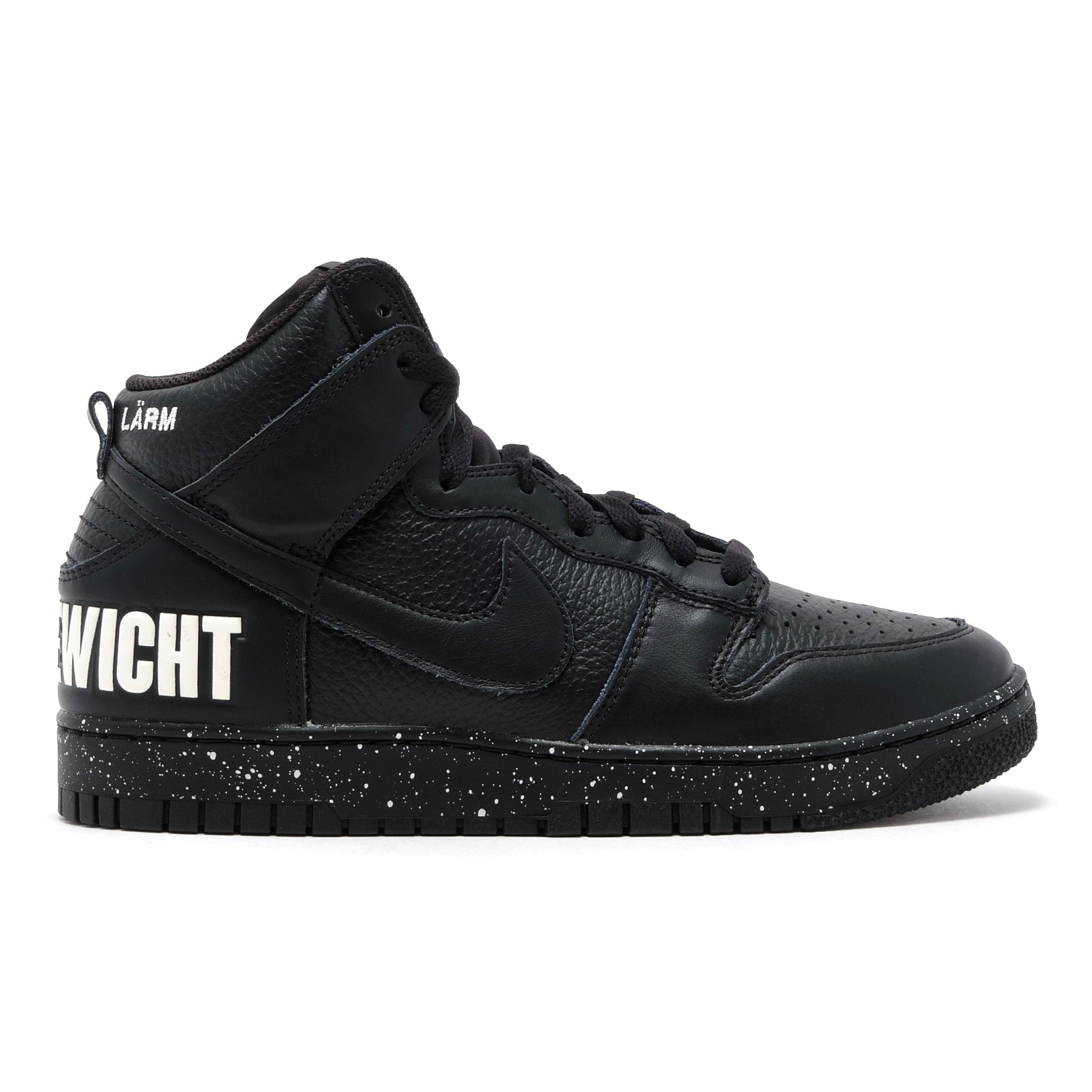 In a black monochromatic look, the Nike Dunk High Undercover Black embraces the signature 1985 Dunk silhouette with elongated collars and tongues. Smooth and tumbled leather construction offer a variety in touch, but maintain the design's low key appearance. At the heel, contrast printing of "CHAOS" and "GLEICHGEWICHT" ("BALANCE" in German) symbolize Undercover's motif of embracing the space between two polarizing states.