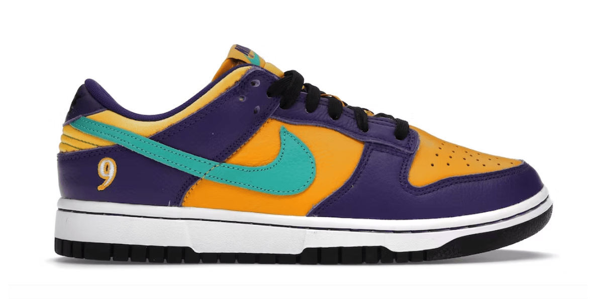 Nodding to Lisa Leslie's time playing for the Los Angeles Sparks, the Nike Dunk Low Lisa Leslie (Women's) boasts the signature Sparks team colors. It features a gold leather upper with deep purple overlays and vibrant turquoise Swooshes. At the heel, Leslie's number 9 is embroidered in a font style similar to the Sparks logo, adding a feeling of customization.