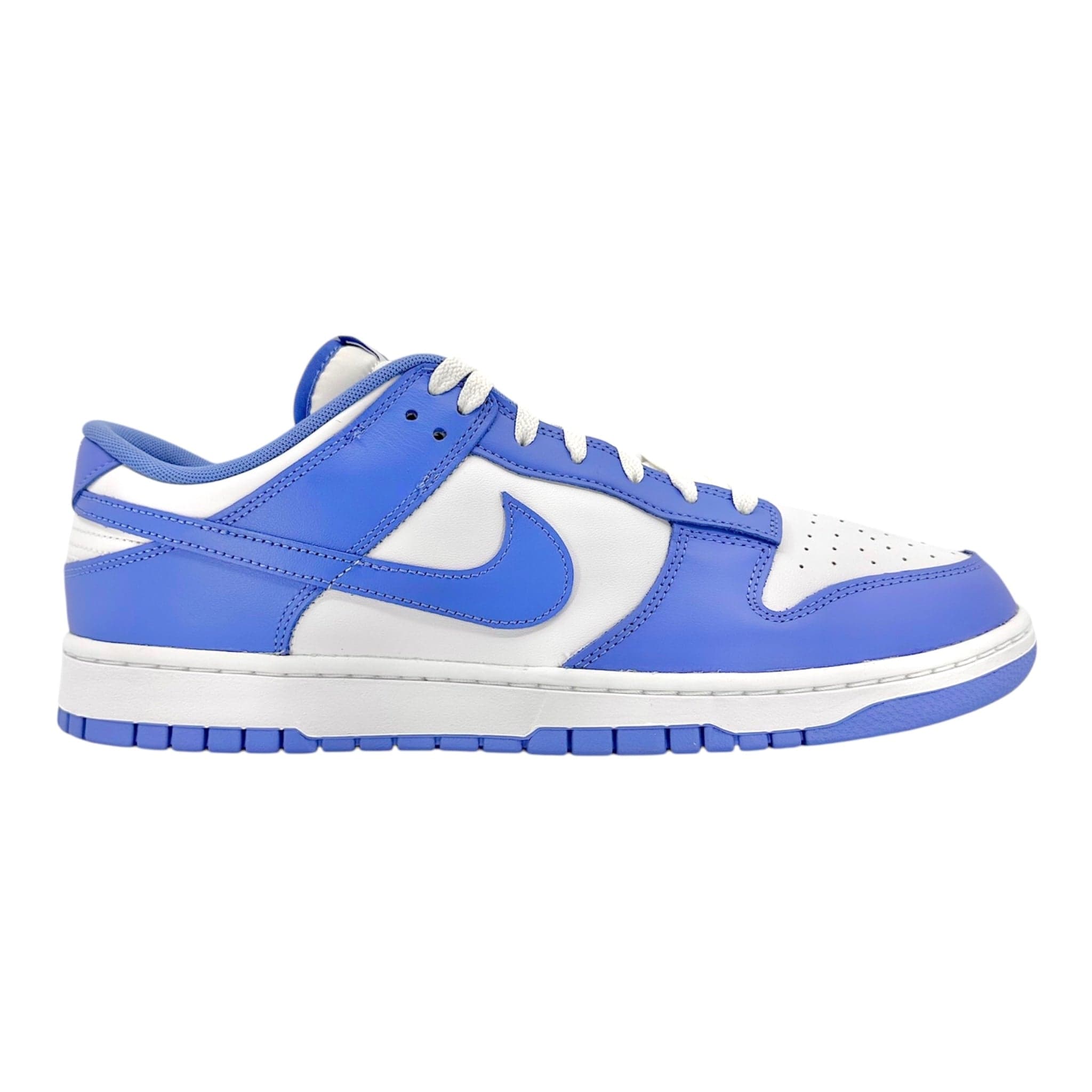 This iteration of the Nike Dunk Low is constructed with leather uppers and a rubber outsole. The base is white rubber, and Polar Blue overlays line the perforated toebox, the heel, the laces, and the midsole. The Nike Swoosh also appears in Polar Blue on the midsole. The tongue is padded for comfort, and white Nike branding is also visible on the heel.