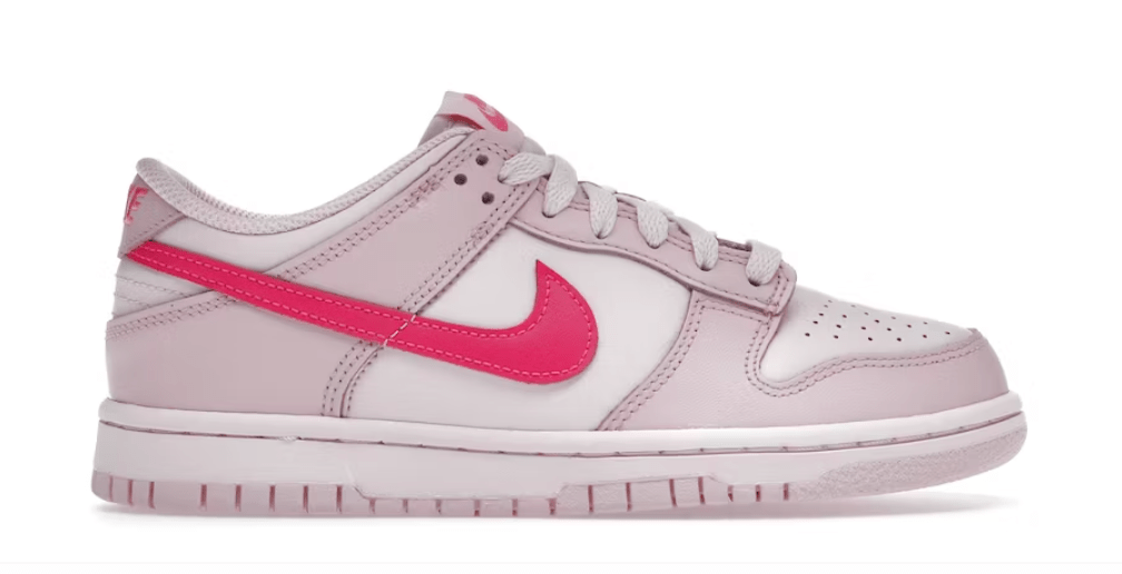 The look is completed by the Nike Swoosh in a bold pink that provides a strong contrast and stands out noticeably on the shoe. In addition to the Swoosh on both sides, the Nike Dunk Low Triple Pink (Grade School) features Nike branding on the sole, heel, tongue, and inner sole. This shoe comes in Grade School (GS) sizing.