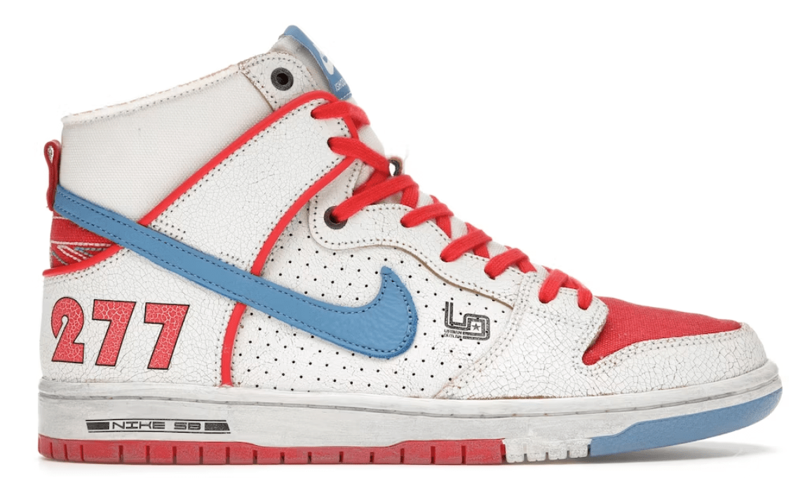 The graphics and color palette on Nike SB Dunk High Pro Ishod Wair x Magnus Walker pay homage to a German sports car made famous in designer Magnus Walker’s 2012 film "Urban Outlaw". Red canvas and white leather make up the upper, while light blue Swooshes are prominent on the sides.