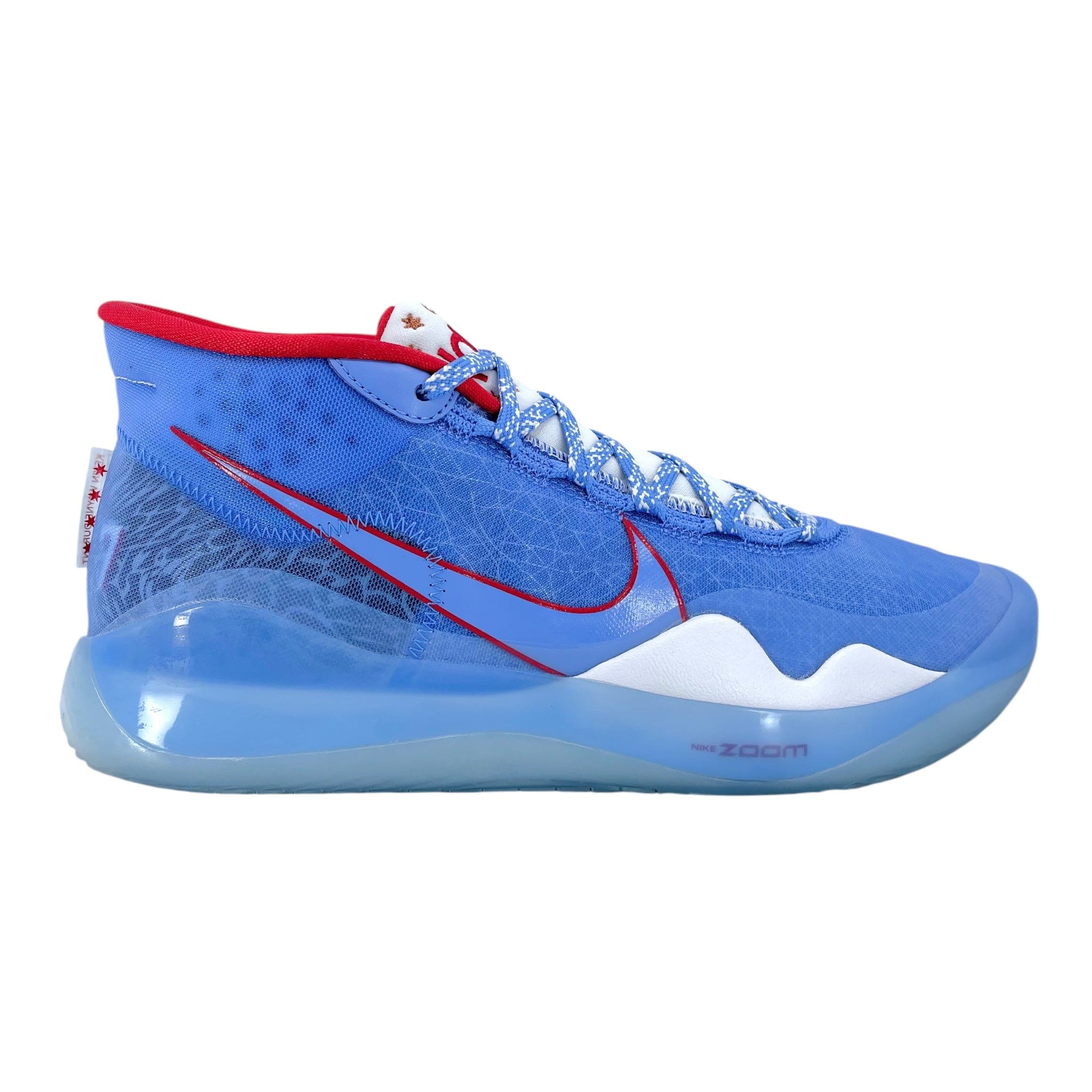 The Nike KD 12 Don C comes in multicolor colorways and is dressed in multilayer mesh and synthetic materials. The outer sole is covered with a light grey color, the midsole has an Icy Blue color, and the lower heel has a multicolor of dark grey, Cement Grey, and Brick Red. The Swoosh lies at the side of the sneaker and a KD logo rests on the tongue.