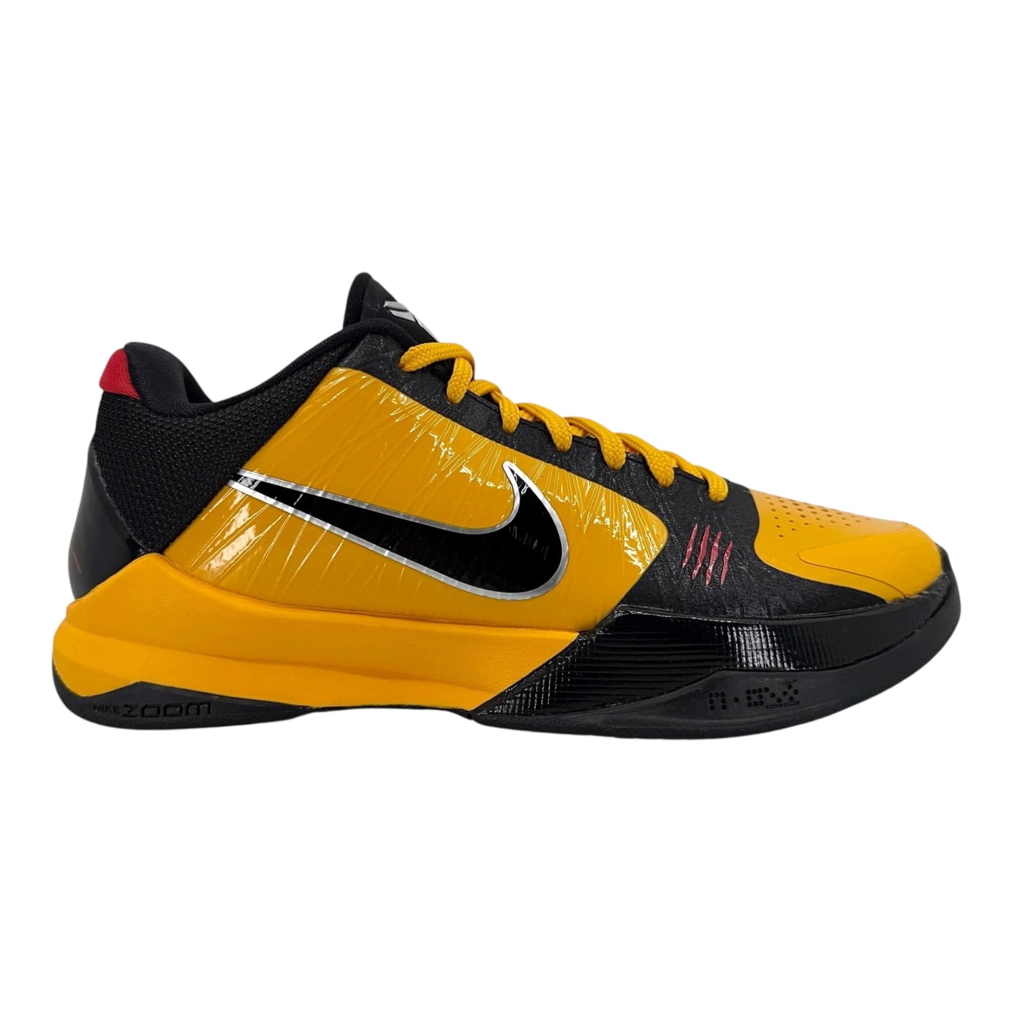 The Kobe V Protro Bruce Lee is inspired by two classic Bruce Lee films, Game of Death and Enter the Dragon. Black and Yellow paneling on the upper pays homage to the one-piece jumpsuit that Lee wore in Game of Death (famously duplicated in Kill Bill), while the red scratch marks on the lateral side pay tribute to the final fight sequence from Enter The Dragon.