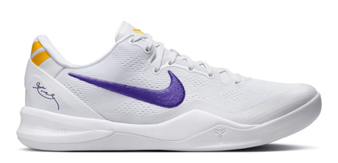 The Nike Kobe 8 Protro Lakers Home brings the energy of the Staples Center straight to your feet. This crisp white colorway is the perfect homage to the Lakers’ home uniforms, featuring a white engineered mesh upper, white midsole, and matching outsole. The purple embroidered Nike swoosh and Kobe’s signature in gold on the heel clip provide striking contrasts, while the gold Kobe logos on the tongue and heel tie the entire design together in true Lakers fashion.