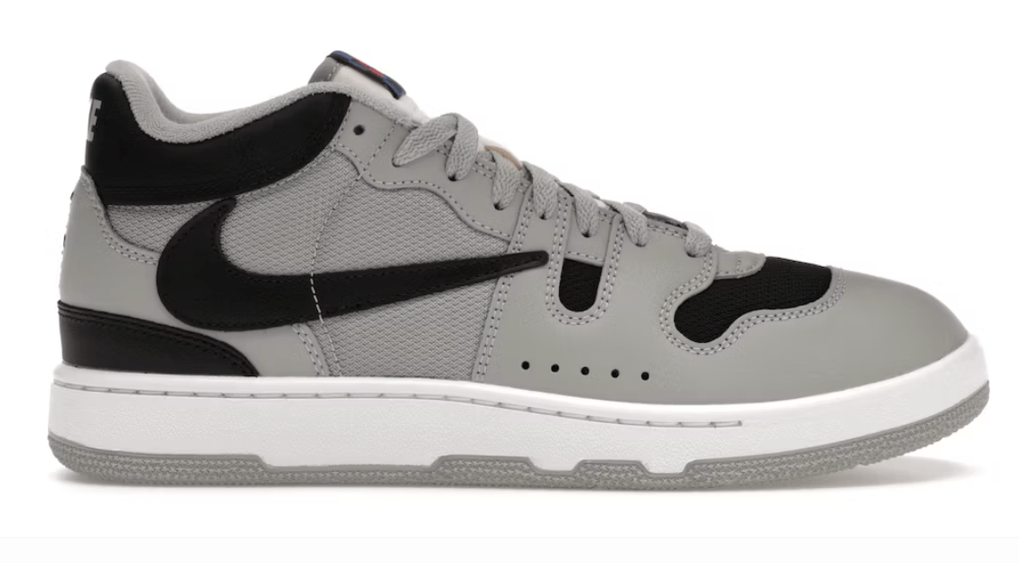 The Nike Mac Attack QS SP Travis Scott Cactus Jack is unveiled in an engaging Light Smoke Grey, Black, and White color combination, incorporating a mix of leather and mesh across its upper. The mesh is prominently featured on the vamp and side panels, while high-quality leather forms the majority of the shoe’s construction.