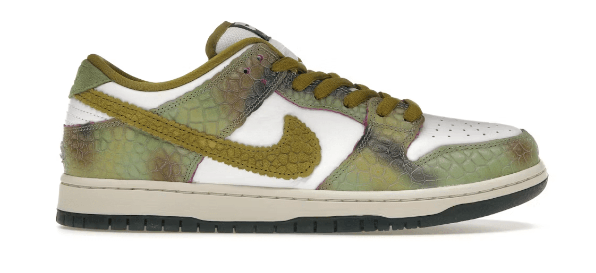 The Nike SB Dunk Low Alexis Sablone Chameleon is a creative collaboration between Nike SB and pro skateboarder, Alexis Sablone. Known for her unique style both on and off the board, Sablone draws inspiration from chameleons for this standout design. The sneaker features an oil green, desert moss, and white colorway with chameleon-like color-shifting panels and scale-textured overlays that make it truly one-of-a-kind. The playful design is a nod to the ever-evolving world of skateboarding and style.