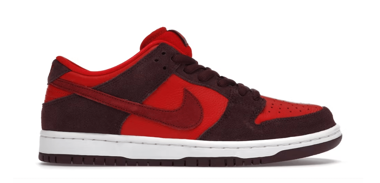 As part of the 2022 Nike SB Fruit Pack, the Nike SB Dunk Low Cherry features a Team Red tumbled leather upper with dark maroon suede overlays and burgundy Swooshes. On the inside face of the tongue, a woven label depicting a cartoon-style cherry character adds a playful look to the silhouette. At the base, a cushioned Zoom Air sole offers comfort and support.