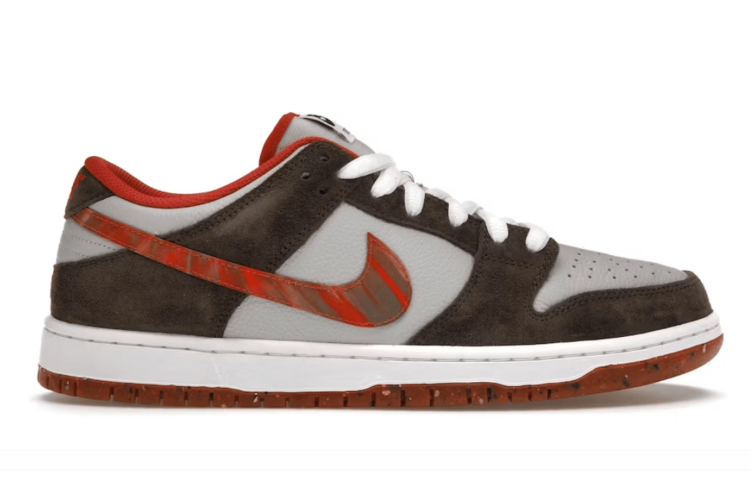 The Nike SB Dunk Low Crushed DC comes in a mix of Olive Grey, Mantra Orange, and Rattan color scheme.