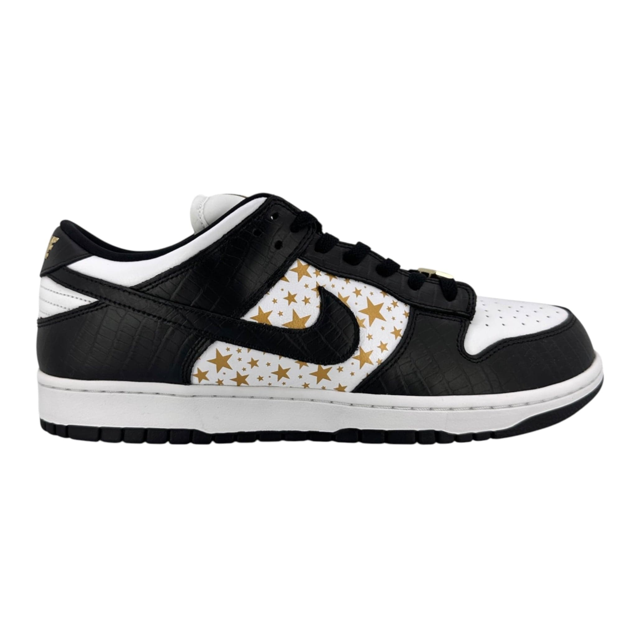 The Nike SB Dunk Low Supreme Black features a white leather upper with black faux croc skin overlays and gold stars printed on the medial panel. Nike branding is prominent on the signature Nike SB overstuffed tongue and croc skin heel patch. A gold metallic Supreme deubré, white midsole, and black outsole wrap up the design.