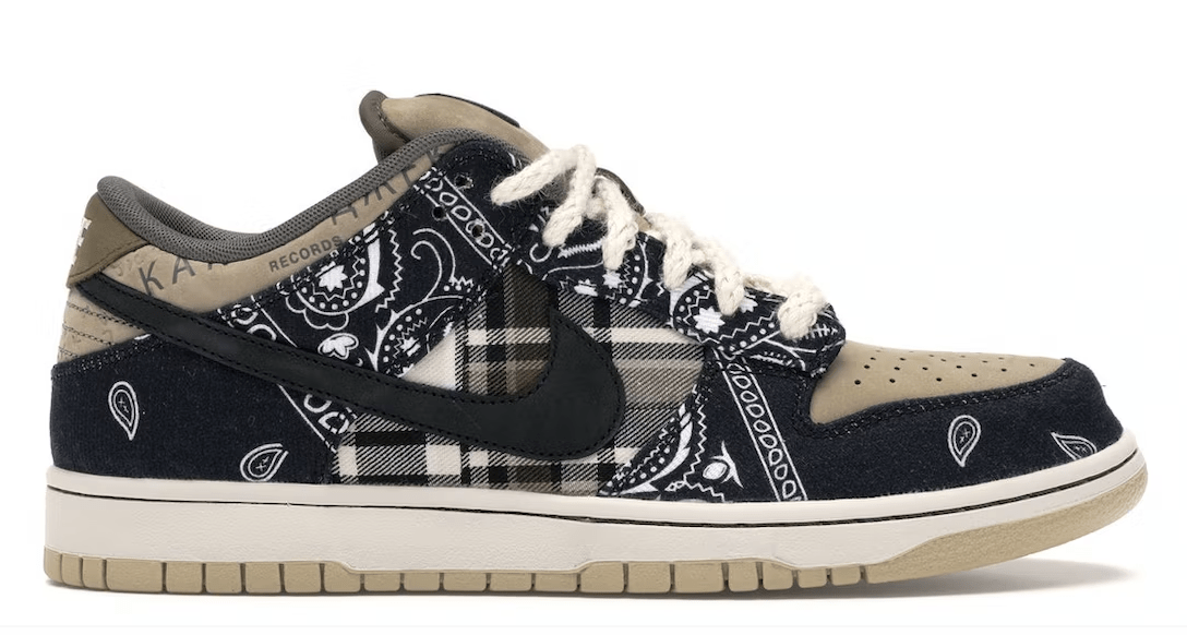Travis Scott teamed up with Nike SB to release his first official skate shoe, the Nike SB Dunk Low Travis Scott (Regular Box). This design follows a similar design aesthetic as seen on the Air Force 1 Low Travis Scott Cactus Jack, featuring an array of materials and prints. Unlike previous Travis Scott releases, these were not available on SNKRS and only available at select Nike SB stockists.