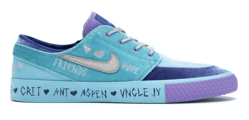 The Nike SB Zoom Janoski RM Doernbecher 2019 delivers colorful design features constructed in rare felt upper with several blue and purple tones. The shoe includes embroidered words "Hope" and "Friends," doodled along a silver Swoosh and heart, and Desiree's therapy cat's name, "Charlie," embroidered on the heel. A blue rubber midsole features names of her family members and a heart texture donning the midsole’s toe bumper, while the clear runner outsole showcases blood droplets.