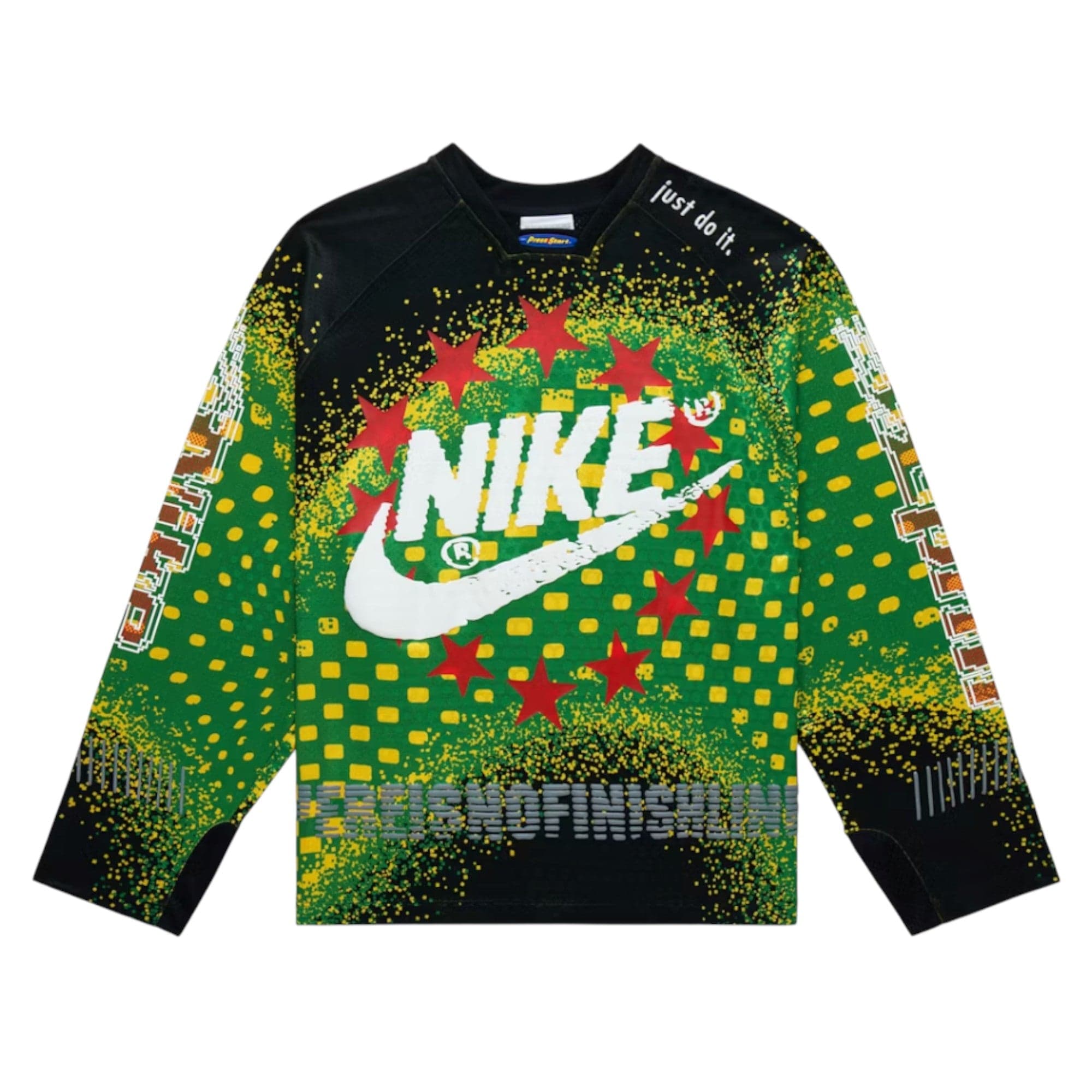 The Nike x Cactus Plant Flea Market "Air Cactus" Goalie Jersey in Multicolor is a striking collaboration that merges sportswear with avant-garde streetwear aesthetics. This unique piece showcases a vibrant multicolor design, incorporating the distinctive visual language of Cactus Plant Flea Market with Nike's athletic heritage. The jersey features a bold, eye-catching pattern that's sure to make a statement, whether worn on the field or as a fashion-forward streetwear item.
