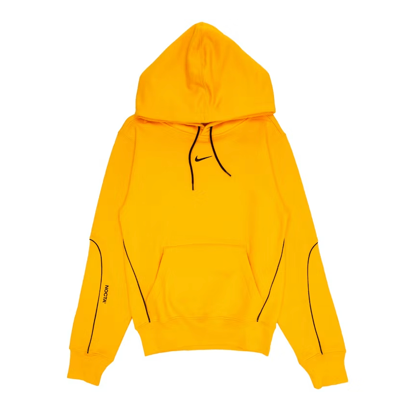 This yellow hoodie was released in mid-December of 2020, as a part of the first release of the Nike x Drake NOCTA collection. NOCTA was created as a collection for the collective, essential apparel pieces fit for both sport and real life. The yellow hoodie from the first NOCTA drop features a black Nike Swoosh as well as black trim accents. The yellow Nike x Drake NOCTA Hoodie was released on December 18th, 2020, at a retail price of $120 USD.