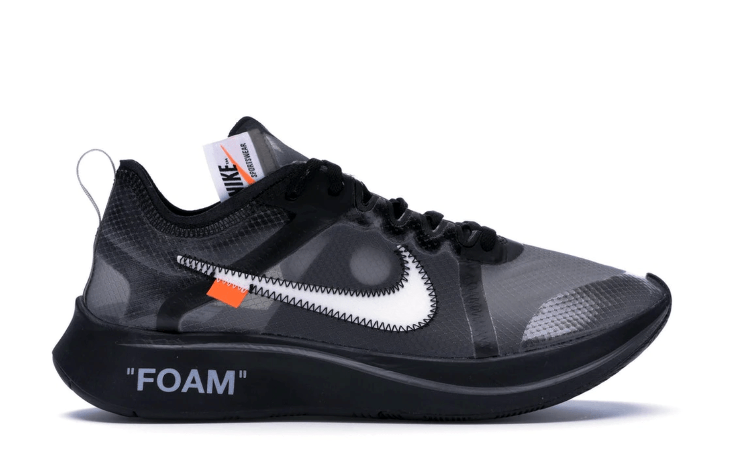Would the Nike Zoom Fly Off-White Black Silver be the new colorway Drake speaks of in "Never Recover"? This sneaker is sporting a translucent upper with black accents, white Nike "Swoosh", black midsole, and a black sole. The inventive shoe released October 2018 and retailed for $160.