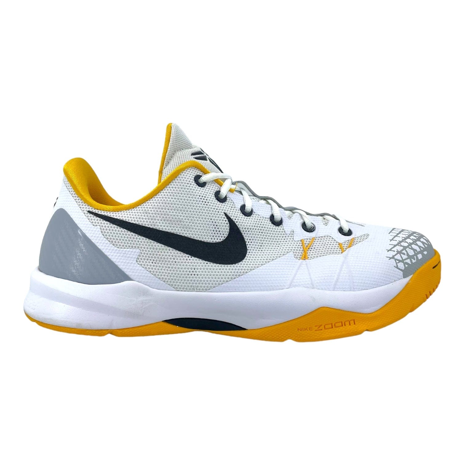 The Nike Zoom Kobe Venomenon 4 'White University Gold' is a low top basketball sneaker that comes dressed in the colors of Kobe Bryant's team for all 20 of his NBA seasons. This shoe, released in August 2014, is nicknamed 'Lakers Home' with its colorway of white, black, University Gold and Wolf Grey. It features Kobe's Nike branding on the tongue and heel and a mostly-white upper with Flywire threading to promote a lightweight, supportive fit. The white, Nike Zoom-equipped midsole rides above a gold outsole.