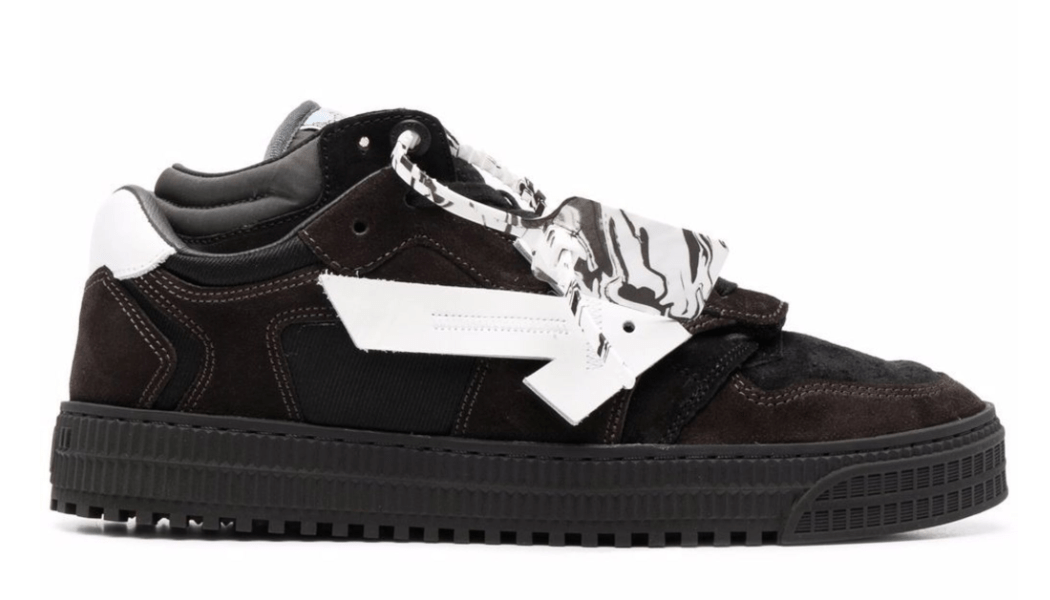 Black suede Floating Arrow low-top sneakers from OFF-WHITE featuring signature Arrows motif, signature Zip Tie tag, round toe, front lace-up fastening, logo patch at the tongue, branded insole and rubber sole.