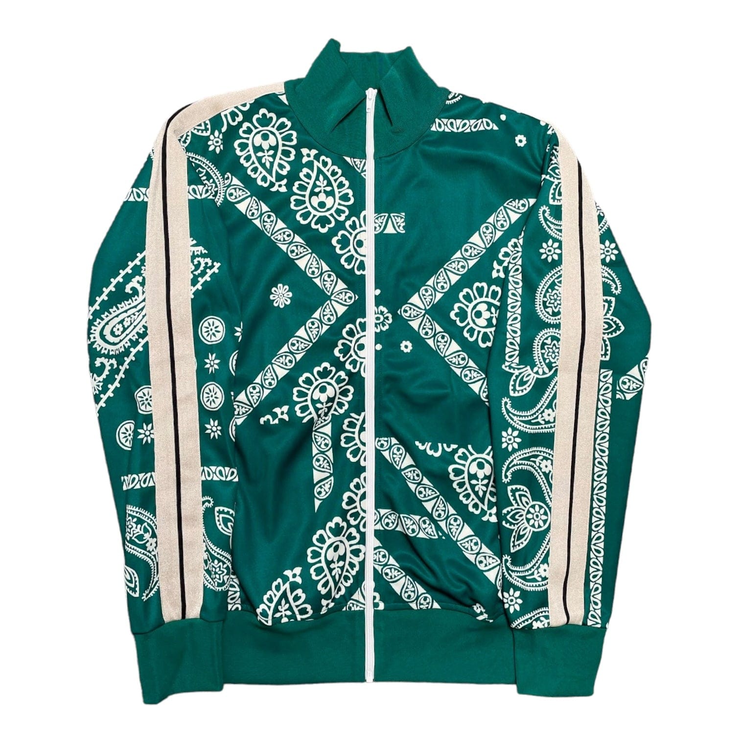 LONG SLEEVES TRACK JACKET IN GREEN WITH BANDANA PRINT IN WHITE ALL OVER WHIT "PALM ANGELS" LOGO. RIB KNIT CUFFS, COLLAR AND HEM. ZIP CLOSURE. TWO ZIP POCKETS. WHITE STRIPES AT SLEEVES.