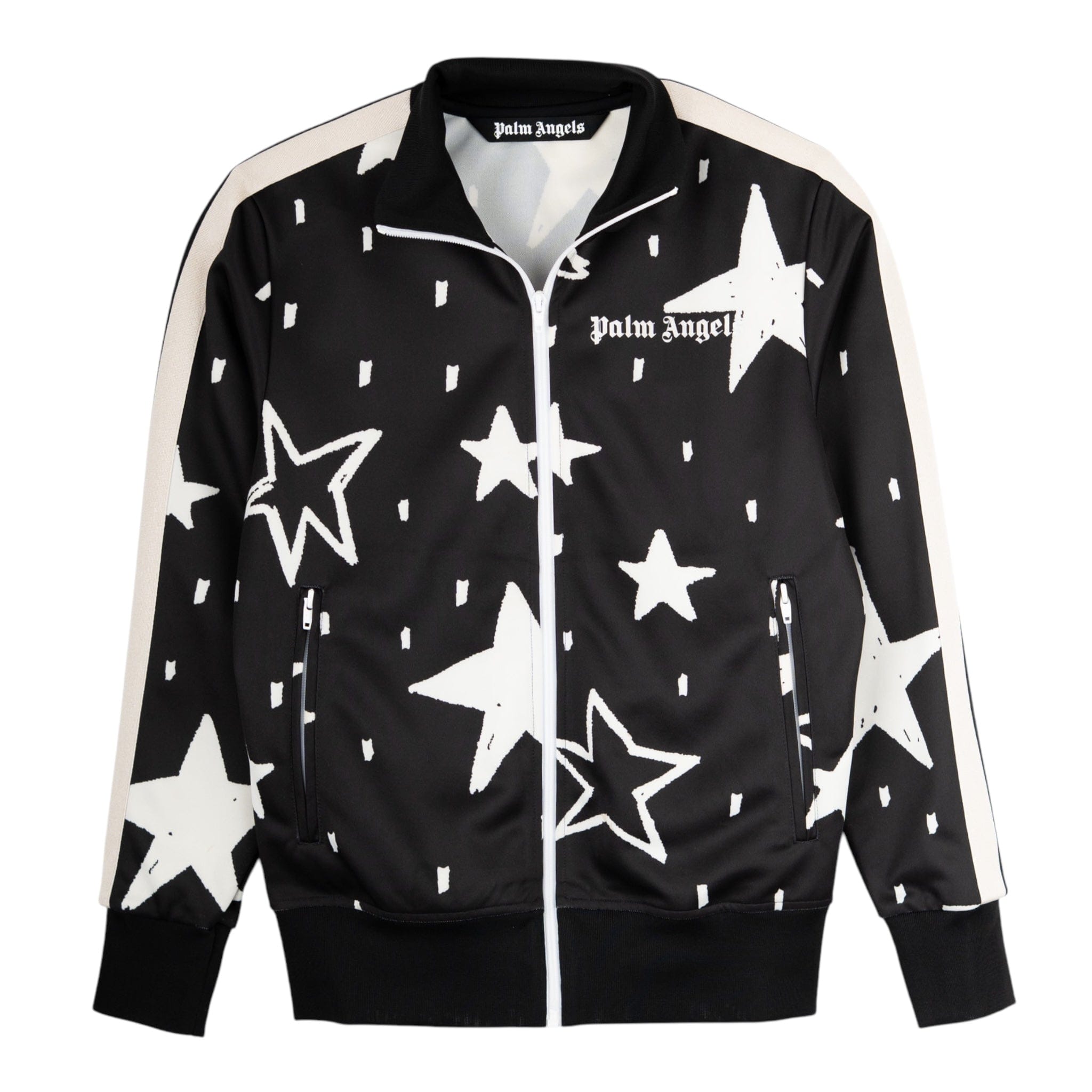 LONG SLEEVES TRACK JACKET IN BLACK. WHITE STARS PATTERN PRINTED ALL OVER "PALM ANGELS" LOGO PRINTED IN WHITE AT CHEST. RIB KNIT CUFFS, COLLAR AND HEM. ZIP CLOSURE. TWO ZIP POCKETS. WHITE STRIPES AT SLEEVES.