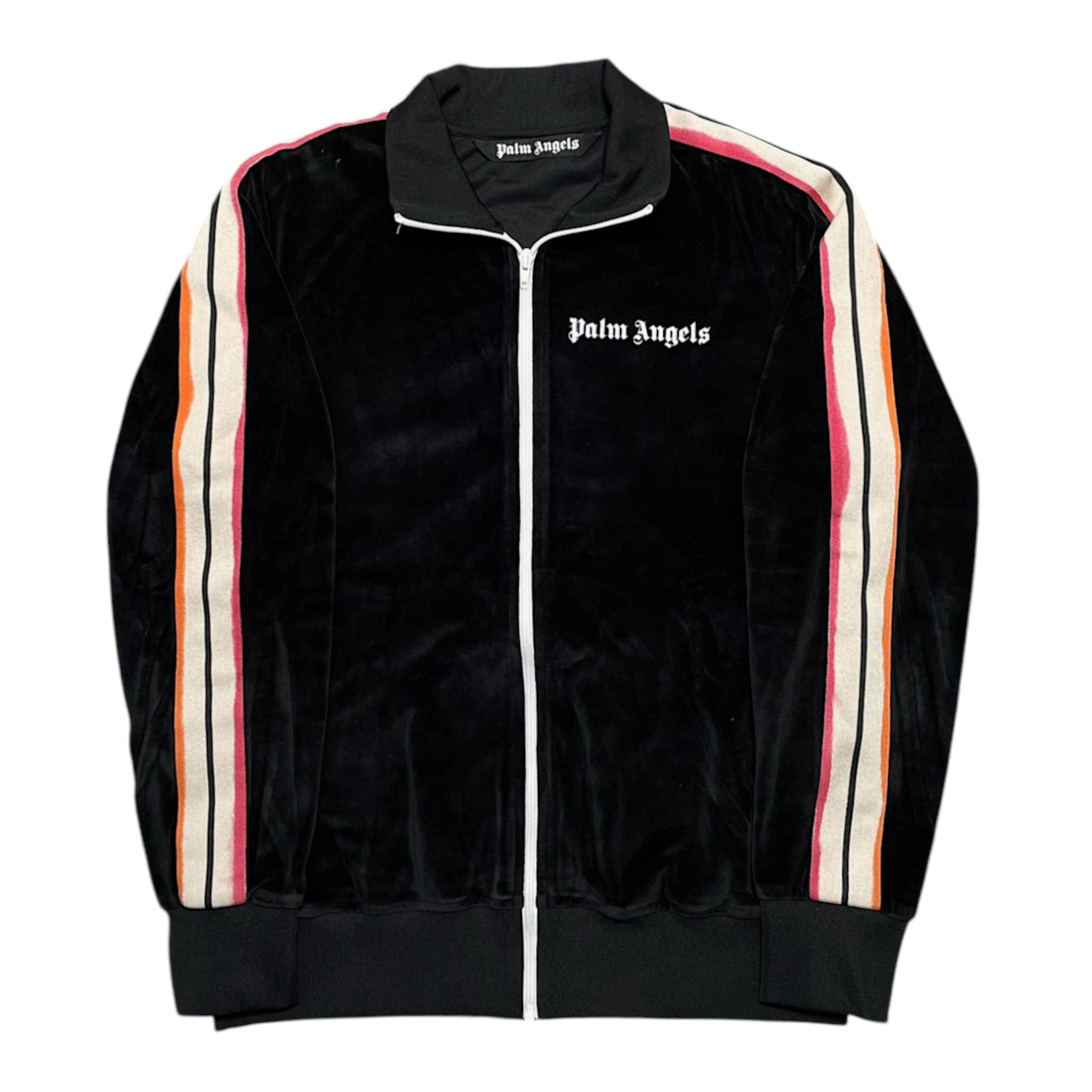 Long sleeve cotton-blend chenille sweater in black. Rib knit stand collar, cuffs, and hem. Zip closure at front. Logo printed in white at chest. Zippered welt pockets at waist. Rib knit appliqué at sleeves striped in pink, beige, and orange. Partially lined. White hardware.
