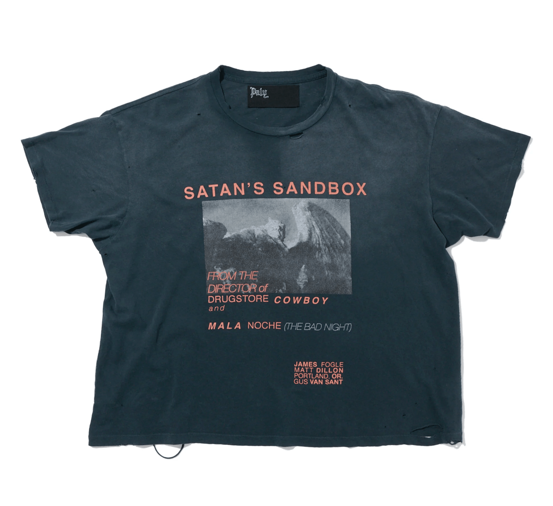 Printed crackle ink graphic authentically distressed at front and back
