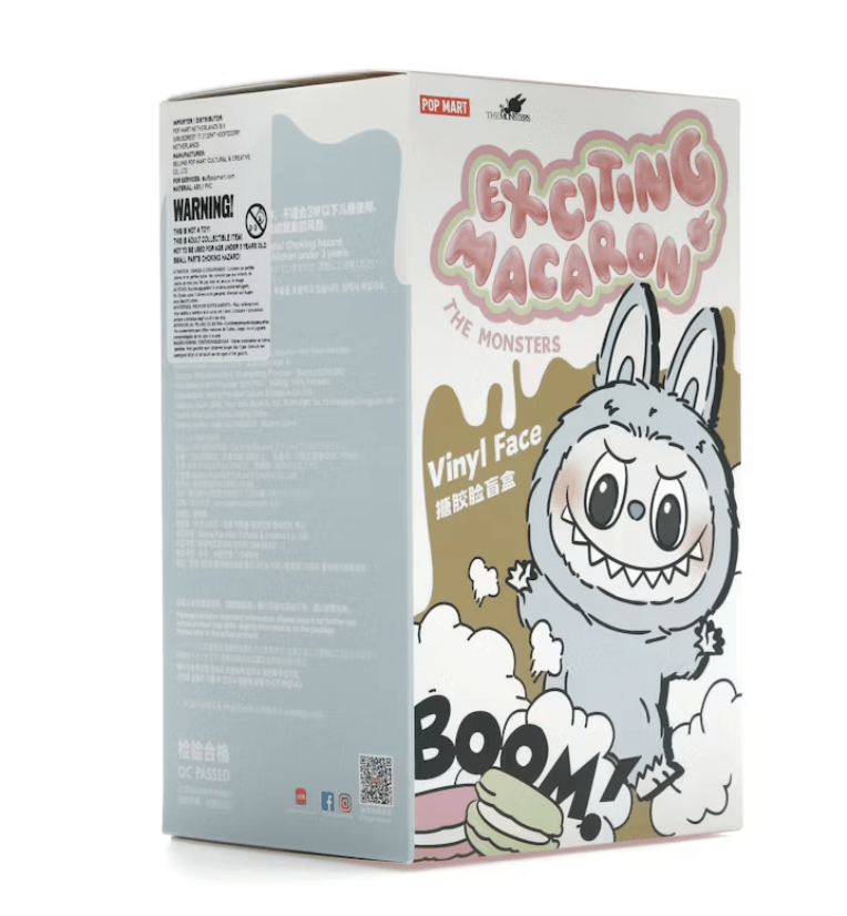 The set could include a miniature Labubu plushie with soft fur in light pink, baby blue, pale green, chocolate brown, cream, light gray, or beige. Each color mimics the pastel hue of a sweet macaroon. In addition, the plushie features a durable vinyl face and a key ring attachment. The key ring is crafted from gold-tone metal, and the ribbon attachment features "THE MONSTERS" in bold lettering. The collectible box conceals the toy within and displays macaroon-themed Labubu graphics. The front reads "EXCITING MACARONS" in pink bubble letters, plus "VINYL FACE" and "BOOM."