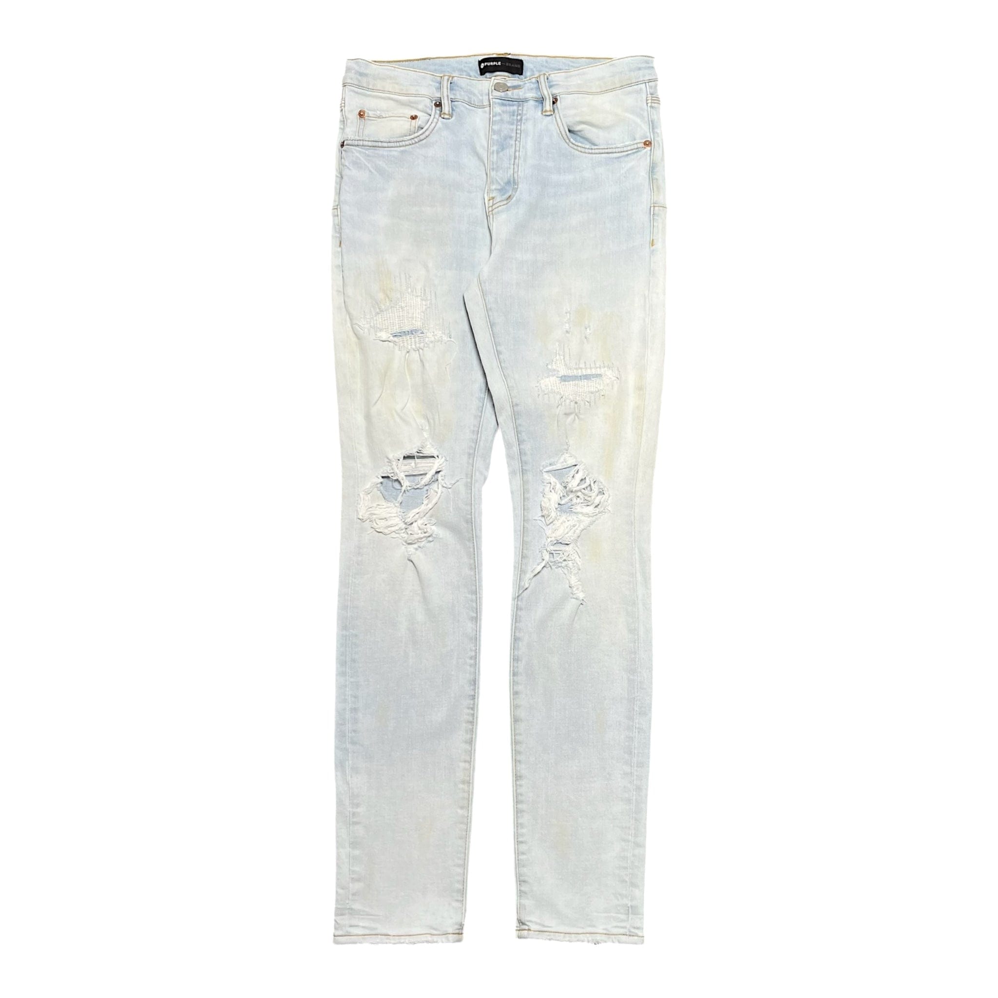 ripped-detail denim jeans from Purple Brand featuring indigo blue, cotton, washed denim, ripped detailing, classic five pockets, front button and zip fastening and straight leg.