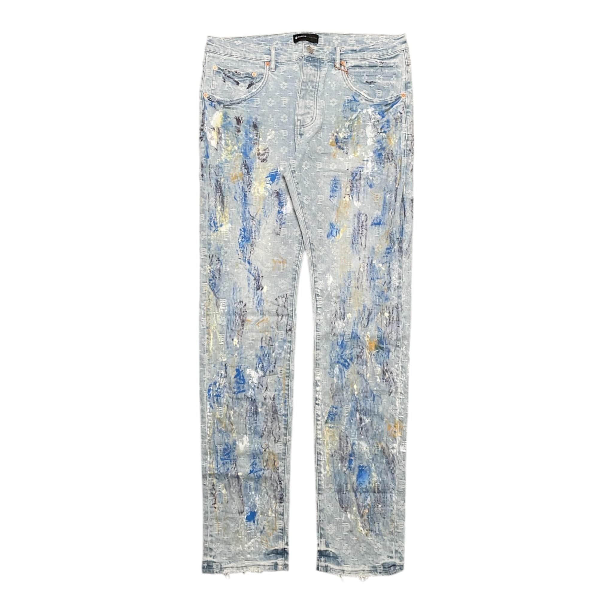 Upgrade your denim rotation with the Purple Brand P001 silhouette. Cut from cotton and lycra, the design is made for a low rise and skinny fit. Reinforced belt loops and hidden back pocket rivets make an additional appearance. Lined detailing at the pockets and yoke add further comfort along with the button fly. The hand-applied paint splatters, bleach stains, abrasions, and monogram print round out the design.