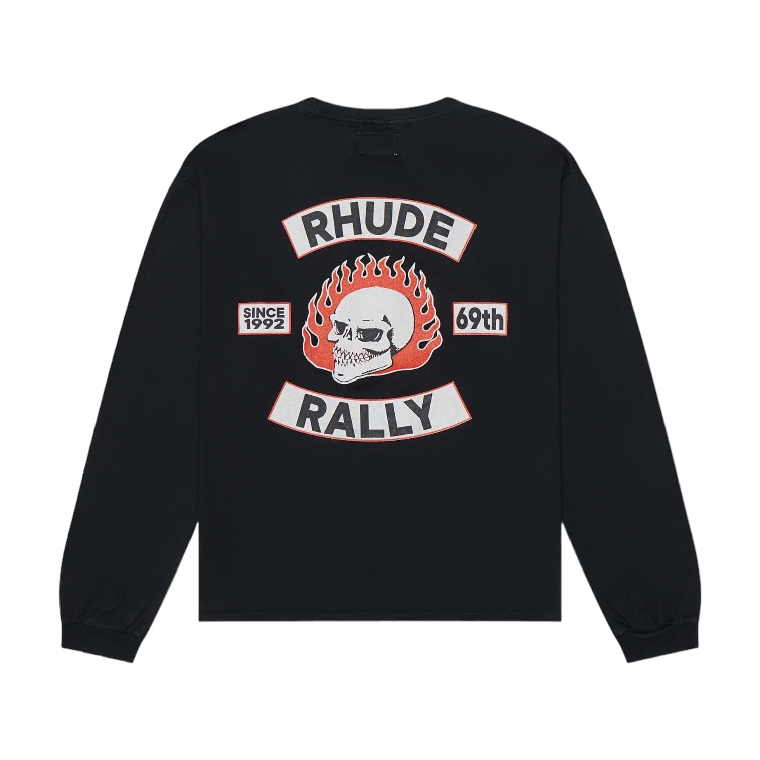 Premium long sleeve tee crafted from soft, lightweight fabric. Features a comfortable and relaxed custom Rhude fit. Ribbed neck and sleeves, with Rhude Rally graphics printed at front chest and back.