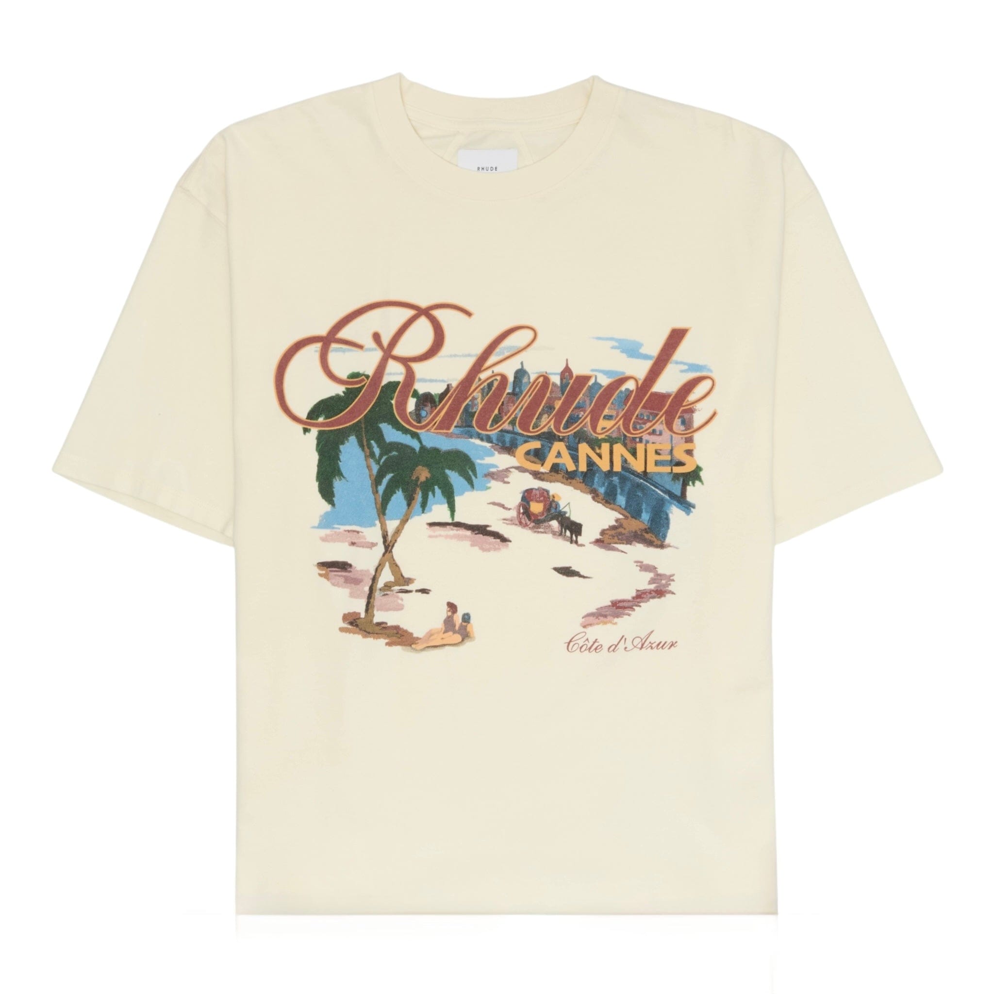 Custom-vintage fit cotton tee shirt with a ribbed neckline and short sleeves. Features RHUDE Cannes Beach design printed on front.
