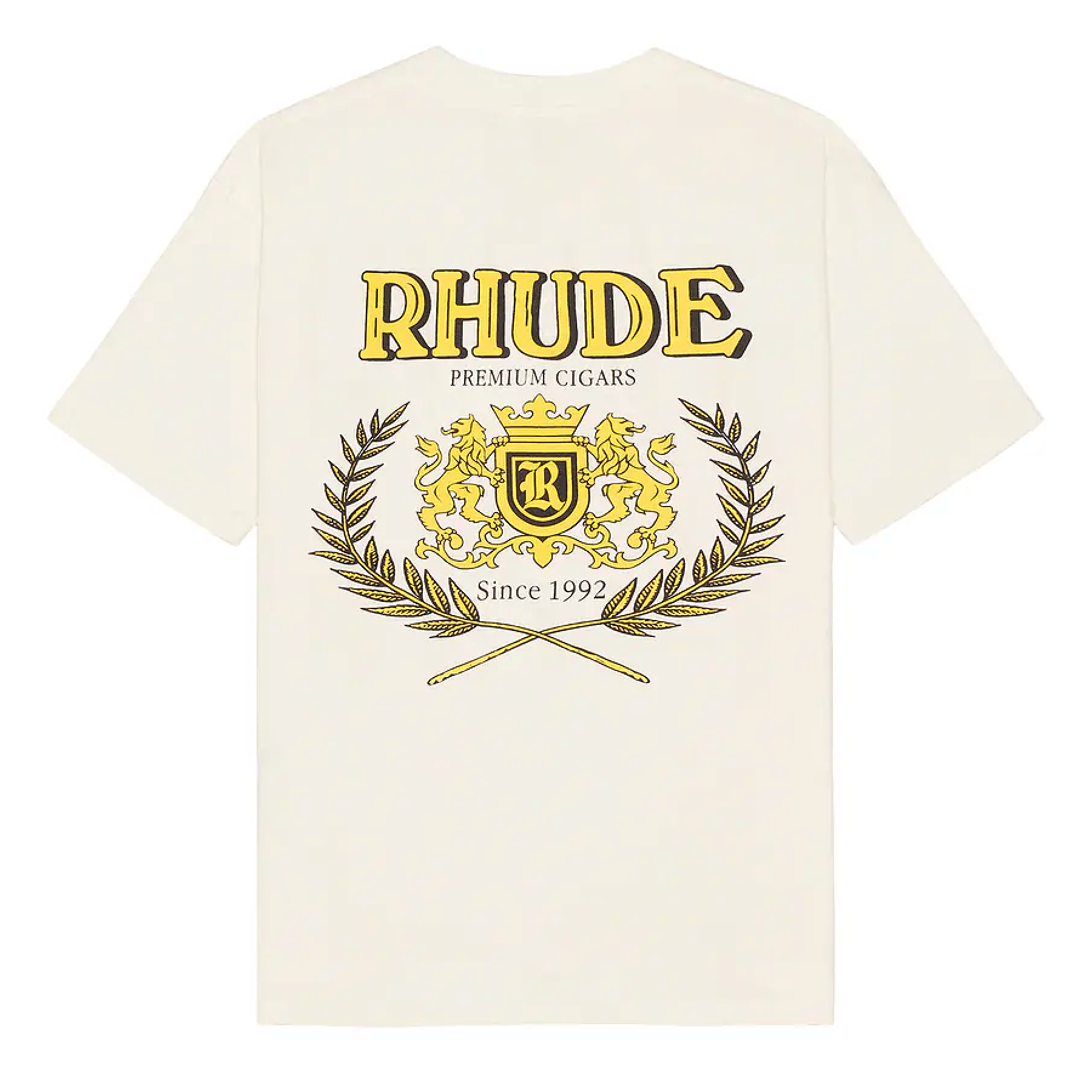 Custom-vintage fit cotton tee shirt with a ribbed neckline and short sleeves. Features RHUDE Cresta Cigar designs printed on front and back.