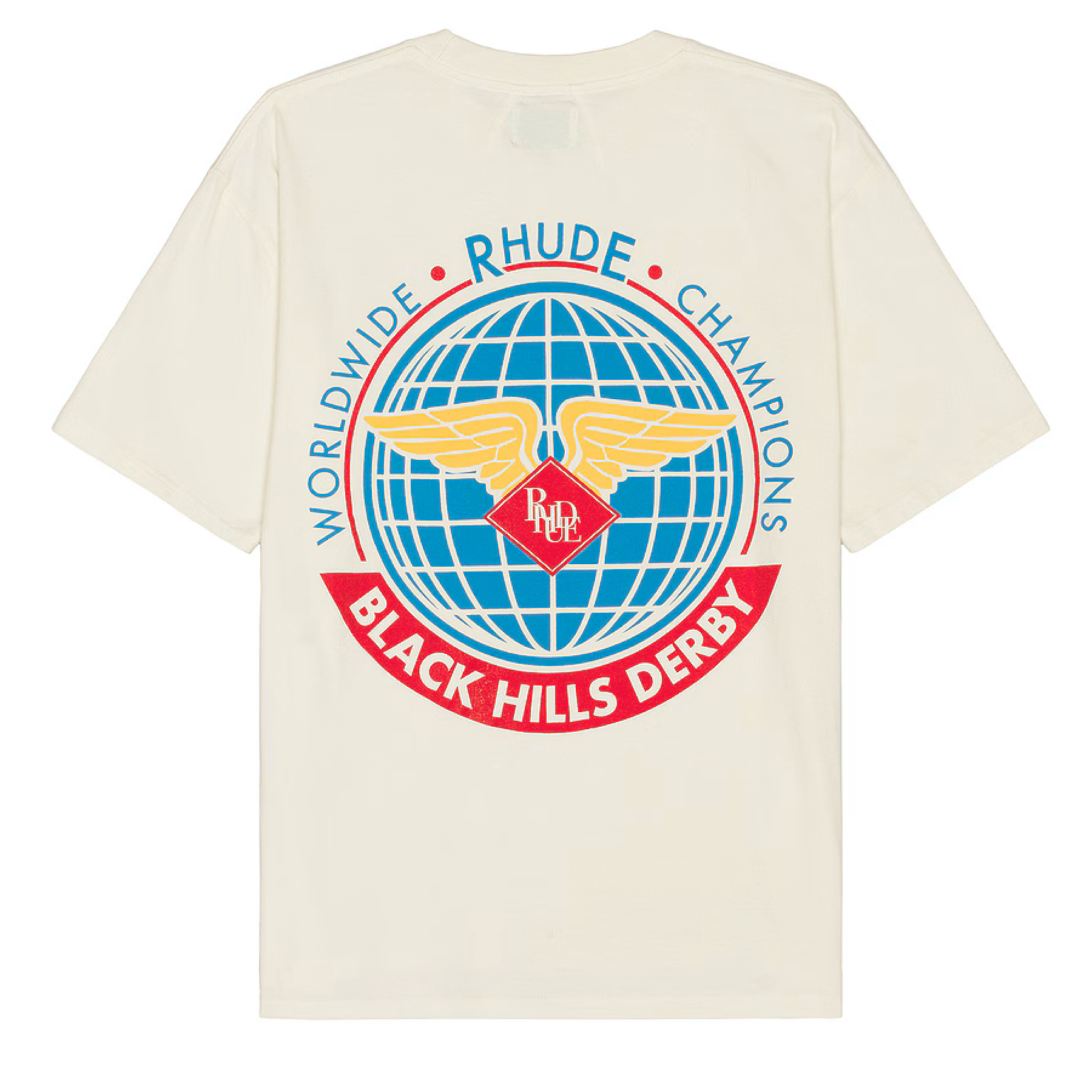 Custom-vintage fit cotton tee shirt with a ribbed neckline and short sleeves. Features RHUDE Worldwide Champions design printed on front and back.