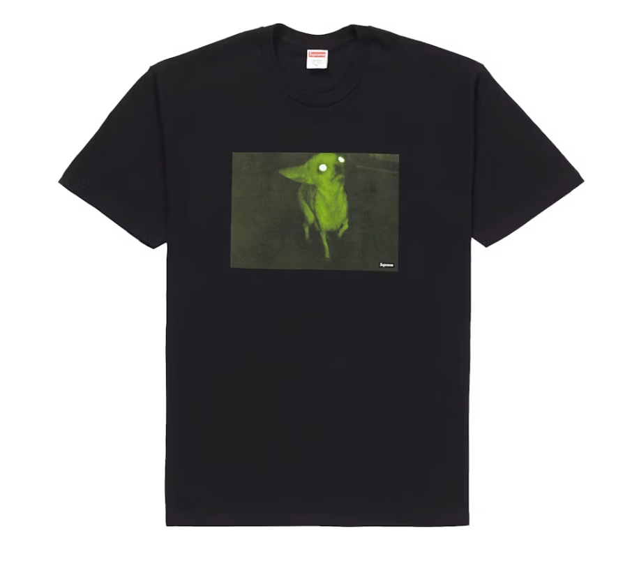 The Supreme Chris Cunningham Chihuahua Tee Black is a limited edition t-shirt released by Supreme on November 8, 2018. The shirt features a graphic of a chihuahua wearing a Supreme box logo collar, with the words Supreme and Chris Cunningham written above and below the image. The shirt is made from 100% cotton and is available in black. The release of this t-shirt was in collaboration with British video artist Chris Cunningham, who is known for his work with artists such as Aphex Twin and Björk. The chihuahua graphic is a nod to Cunningham's music video for Aphex Twin's Come to Daddy, which features a similar creature. The retail price for the Supreme Chris Cunningham Chihuahua Tee Black was $44, but due to its limited availability and popularity among Supreme fans and collectors, it has since become a highly sought-after item on the resale market. Something we love about the Supreme Chris Cunningham Chihuahua Tee Black is its unique graphic design and the collaboration with a renowned artist like Chris Cunningham. Our experts think the standout feature of the shirt is its playful and irreverent take on the Supreme brand, which is known for its streetwear aesthetic and cult following. Overall, we love the creativity and humor that this t-shirt brings to the Supreme collection.