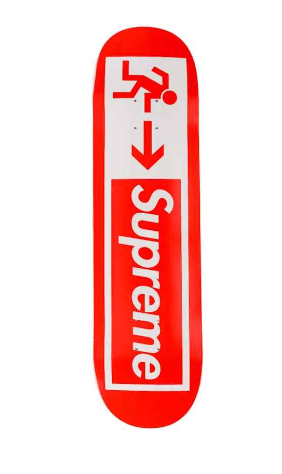 Released in March of 2021 as a part of Supreme's SS21 season, the Supreme Exit Skateboard was a hit with skaters and collectors alike. The deck released for a retail price of $52, selling out instantly on the Supreme web shop and at physical stores globally. It dropped on March 11th, 2021. The deck features the classic Supreme box logo alongside a running person image, typically associated with an exit sign. It dropped in three colors - red, green, and black.