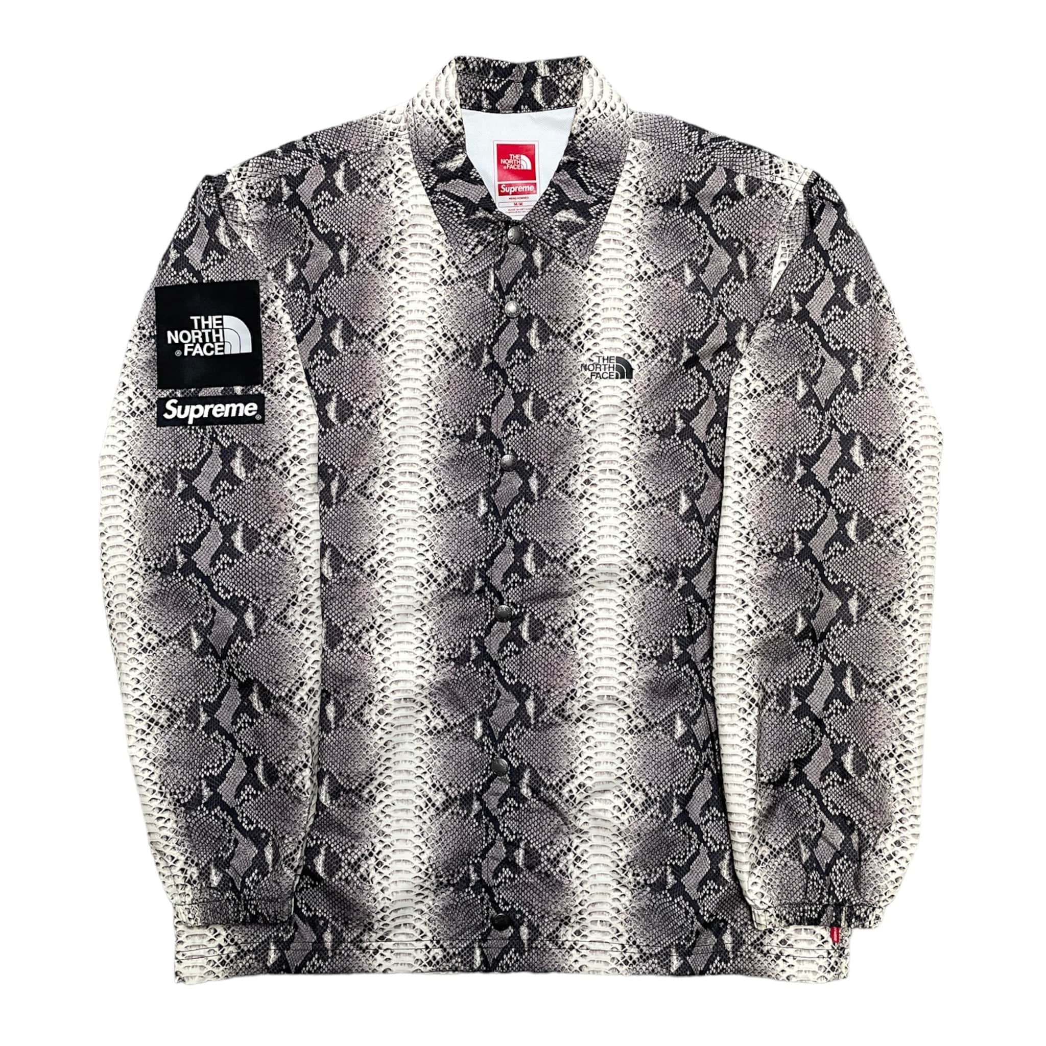The Supreme The North Face Snakeskin Taped Seam Coaches Jacket Black is a waterproof jacket with 2.5 layers of nylon. This jacket has a snap-front closure with zip hand pockets and elastic cuffs. The North Face logo can be found on the chest, back, and right sleeve, and the Supreme logo is located under The North Face logo on the sleeve. It has a snakeskin pattern in black and white.
