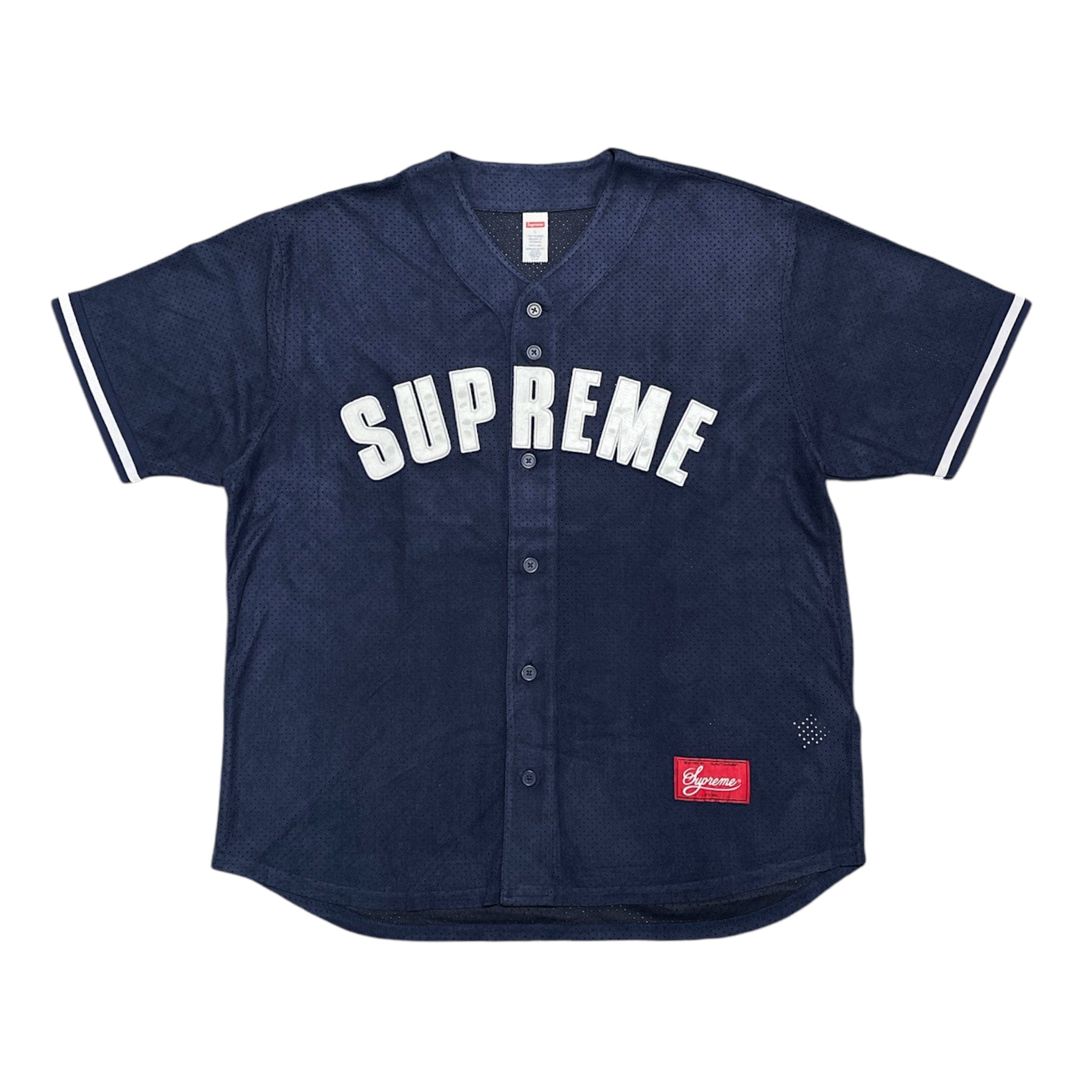 The Supreme Ultrasuede Mesh Baseball Jersey in a navy blue color scheme offers a fresh take on the classic baseball silhouette, featuring a navy blue hue that adds a touch of sophistication to the traditional design, paired with a functional mesh and Ultrasuede construction.