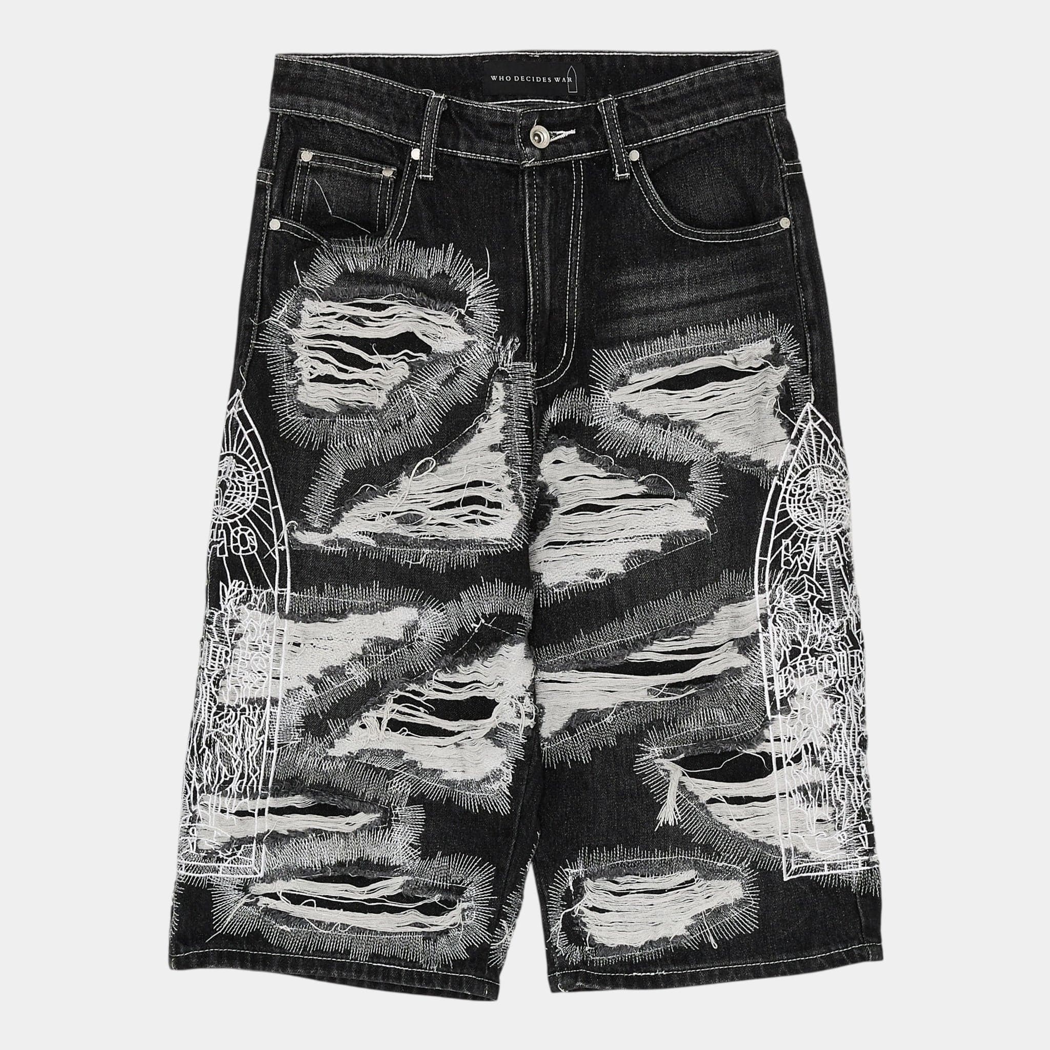 Who Decides War by MRDR BRVDO Darning Side Embroidery Denim Shorts Washed Black White