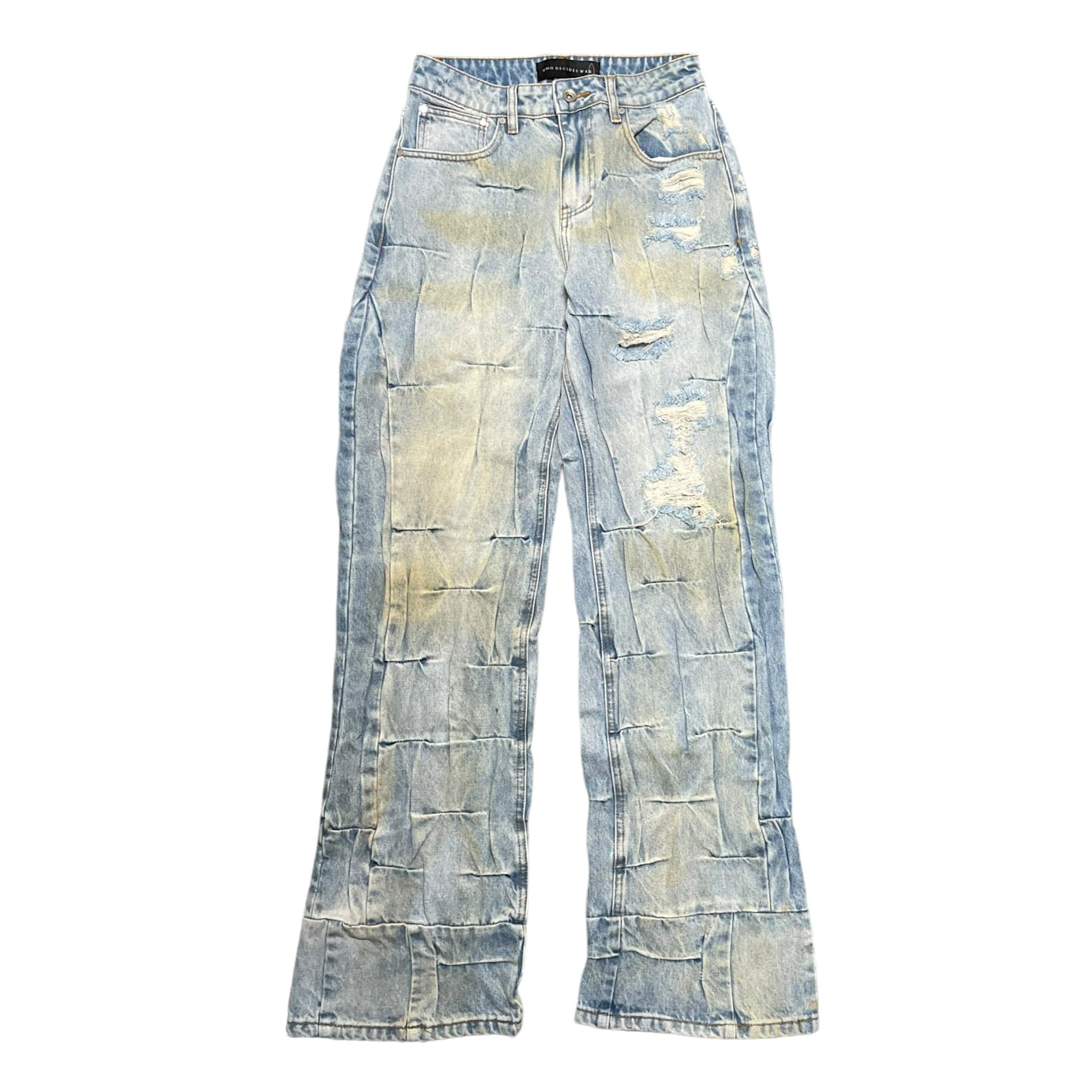 The Gathered Denim are 100% cotton with an oversized fit, pinching technique, flared opening and a 35.5" inseam. Follow your normal size.