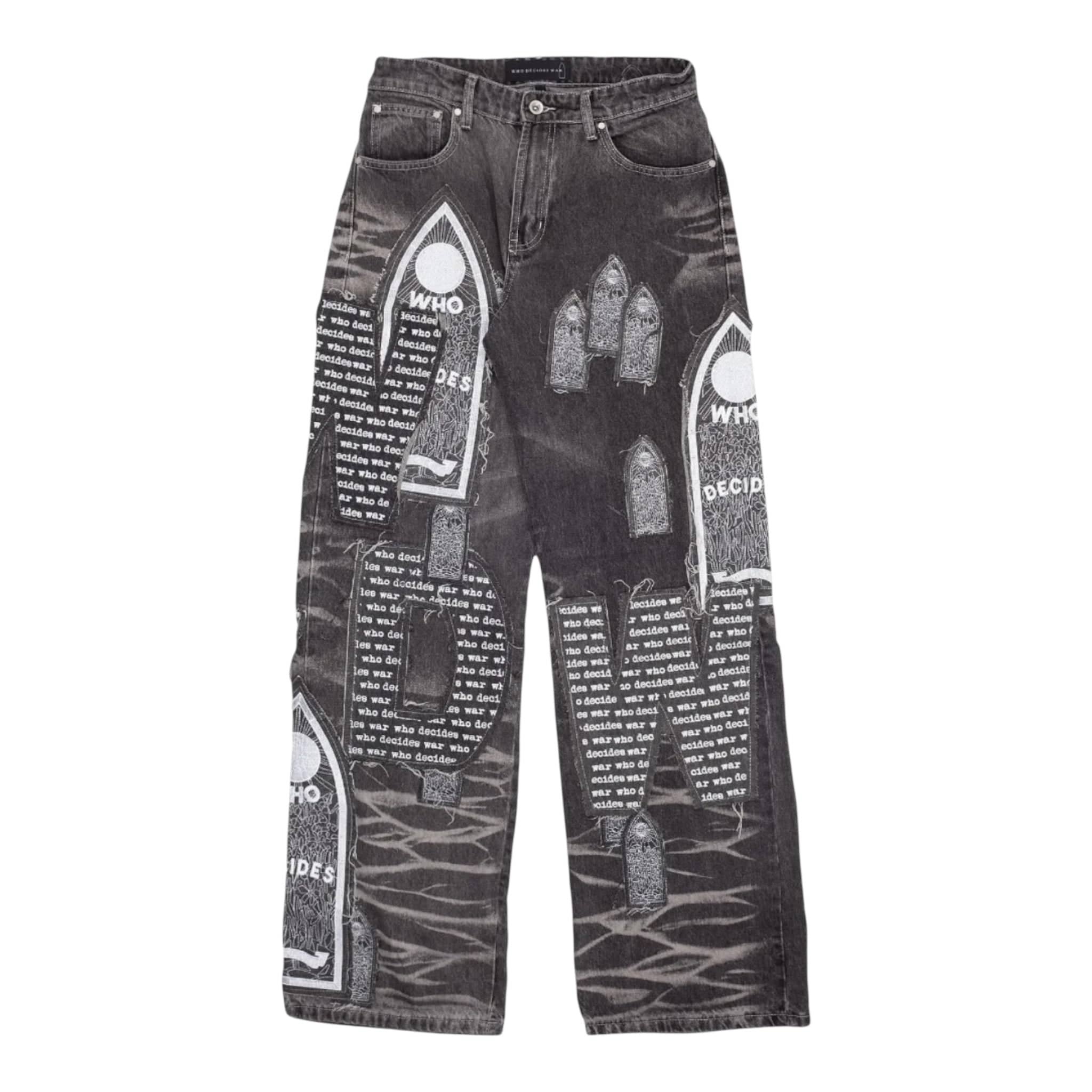 Who Decides War by MRDR BRVDO Motif Scripture Denim Jeans Vintage Grey White