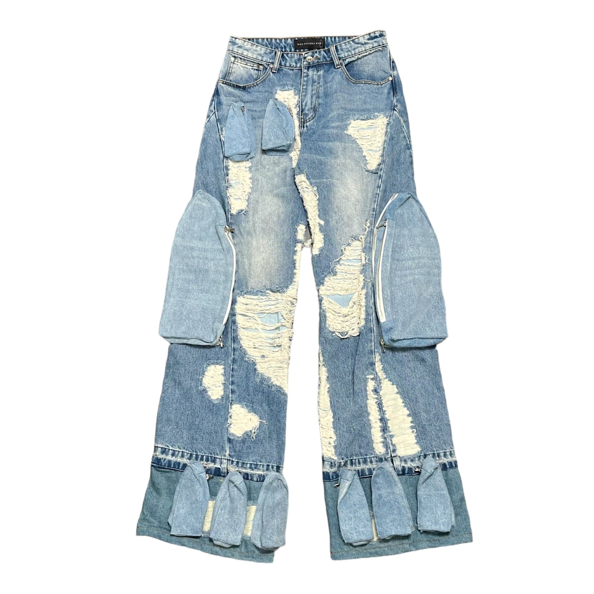 The Multipocket Distressed Denim is 100% cotton with an oversized fit, flared opening, embroidery, distressing and stained glass cargo pockets. Inseam is 35.5 inches. Follow your normal size.