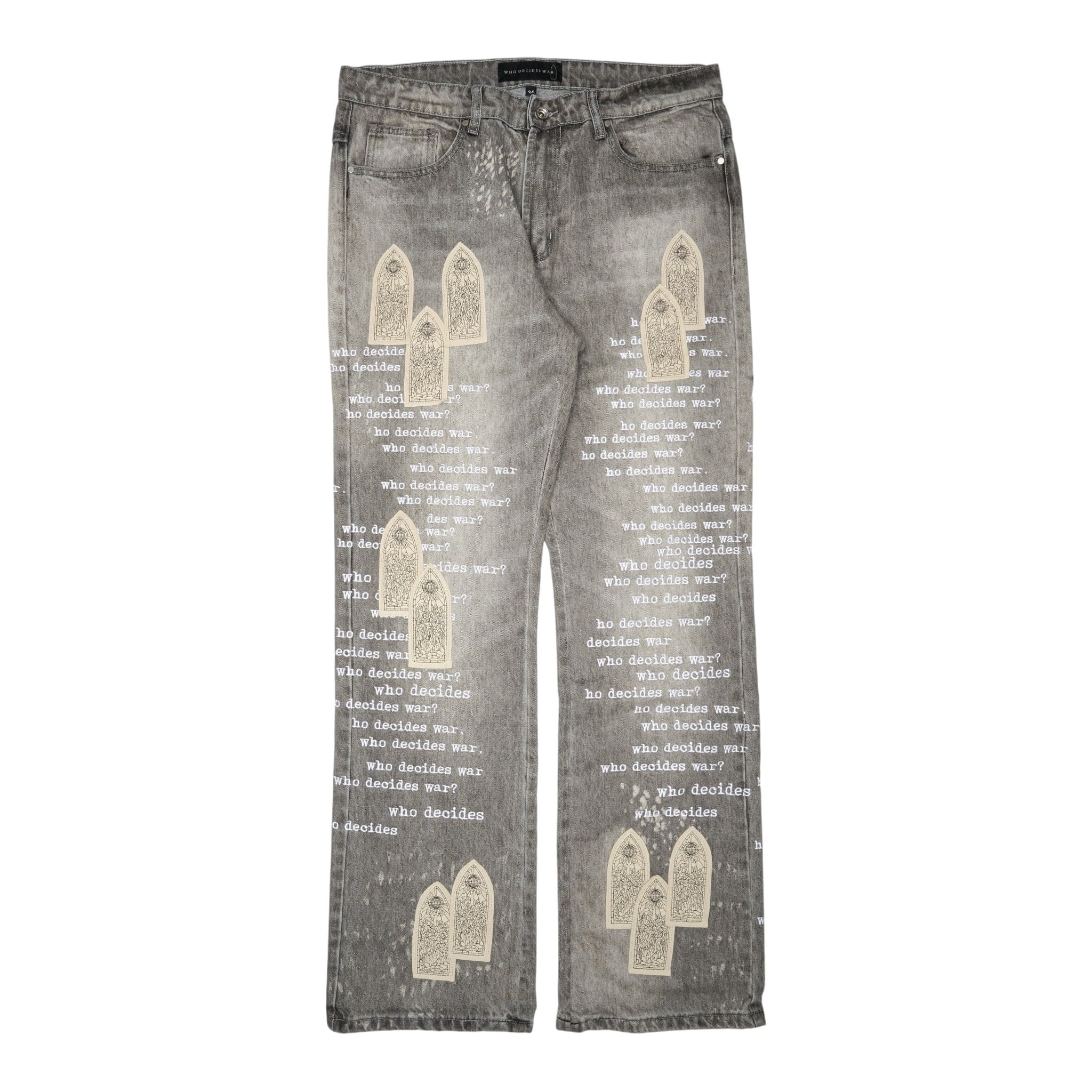 Who Decides War by MRDR BRVDO Scripture Denim Jeans Vintage Grey